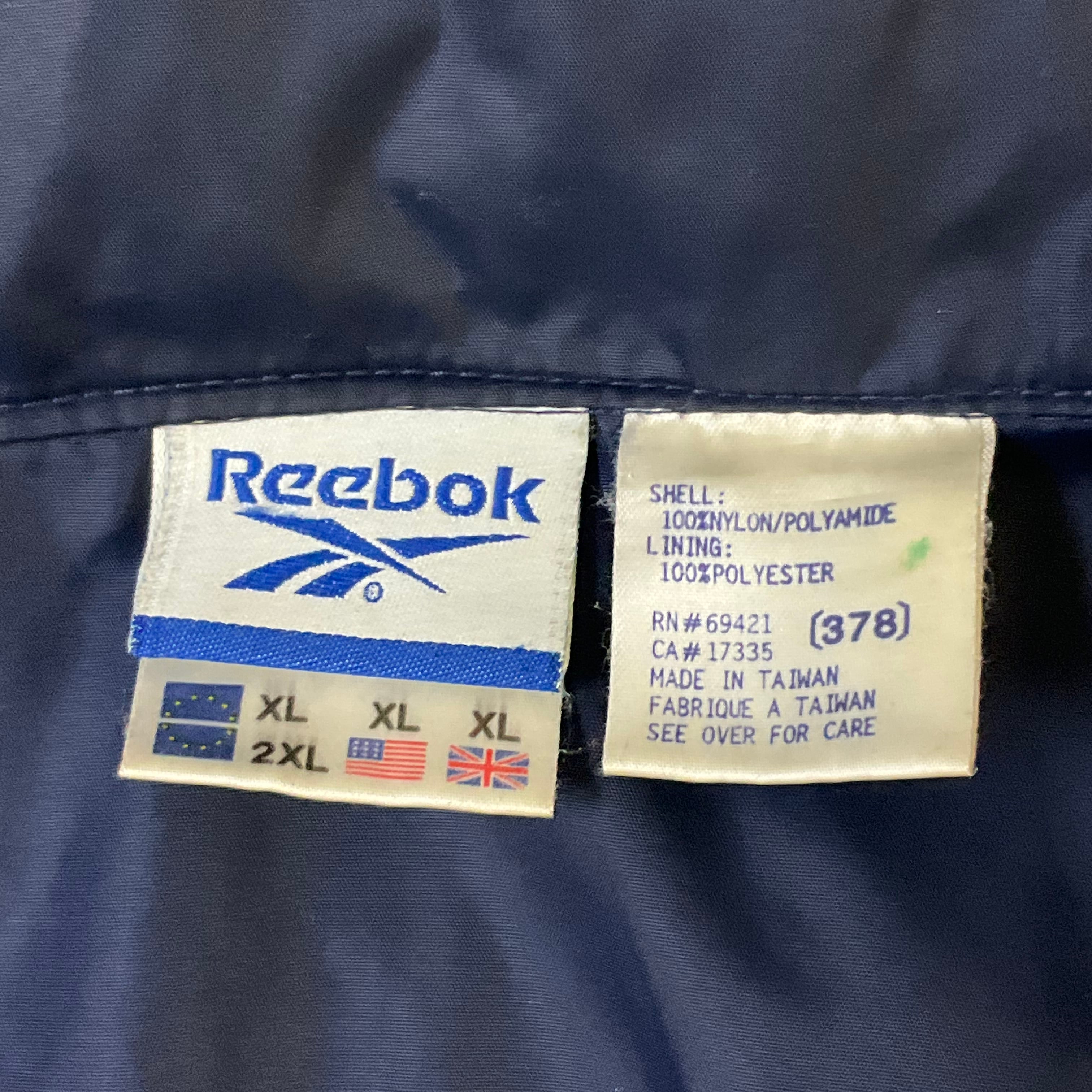 90年代 90s Reebok リーボック ナイロンジャケット ワンポイント刺繍 フード収納型 メンズ2XL 古着 ヴィンテージ ビンテージ ネイビー 紺【f231011009】