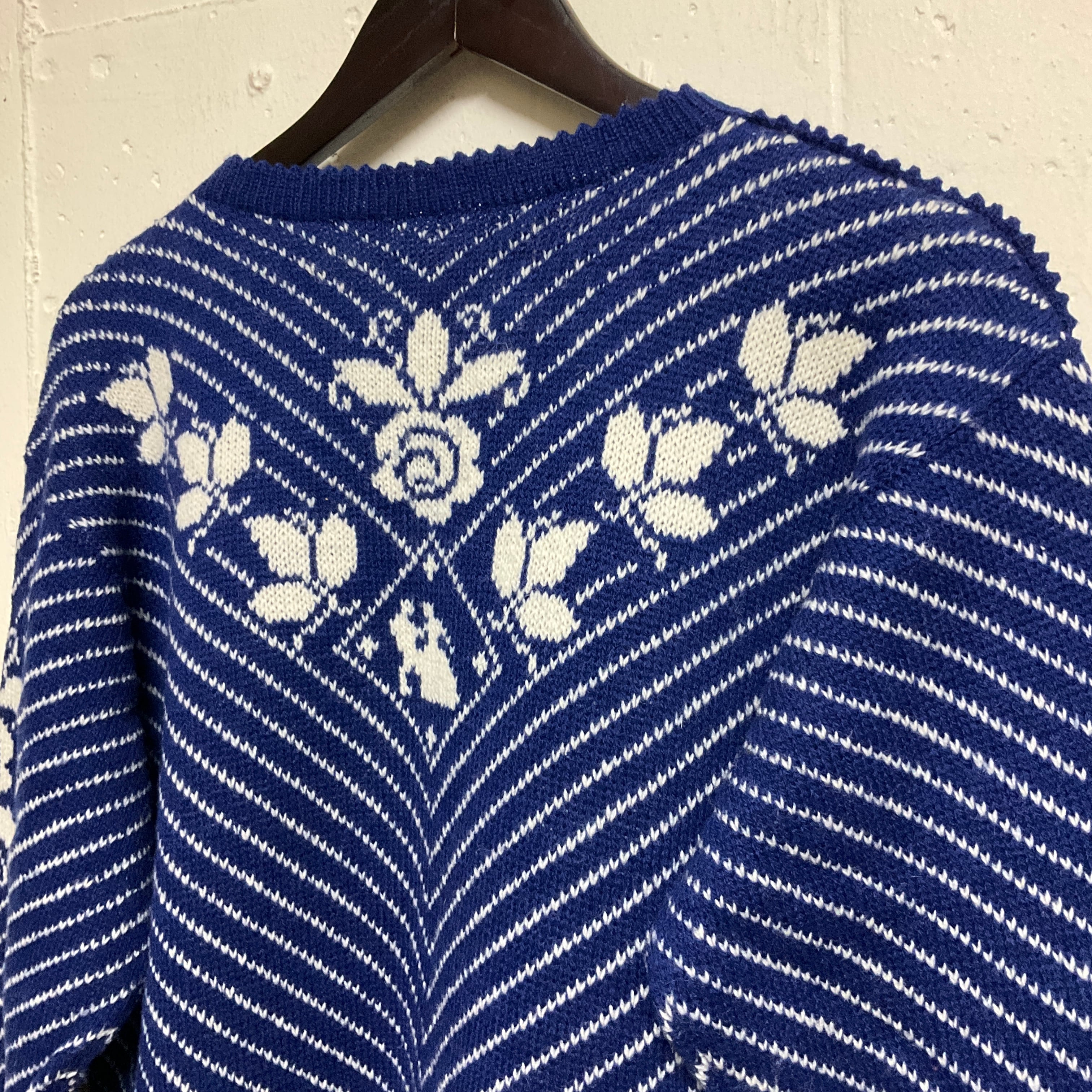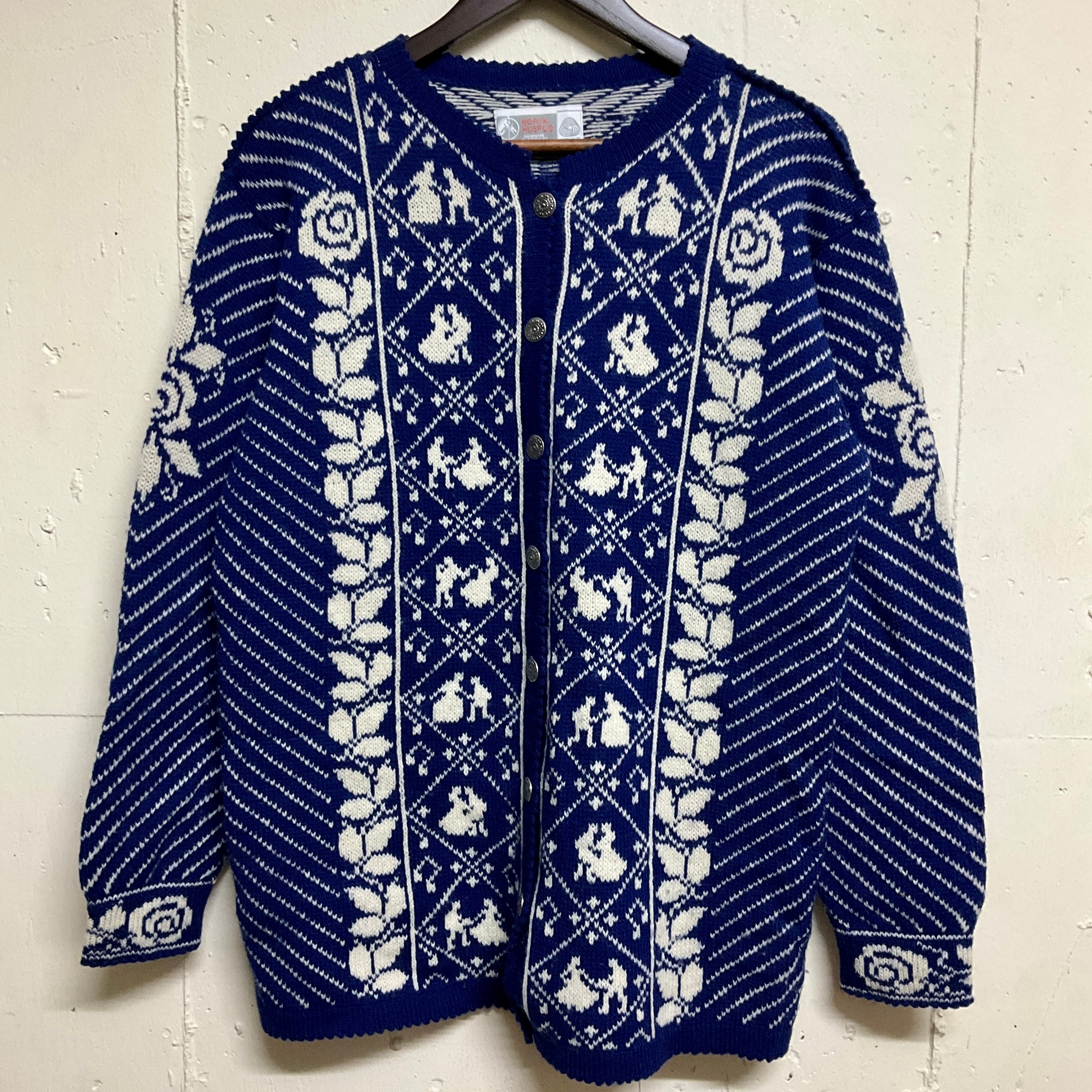 ノルウェイ製 ハンドメイド NORSK HUSFLID 花柄 ダンス ノルディック コンチョボタン 総柄 ニットカーディガン 古着 ネイビー 紺色【f231016008】