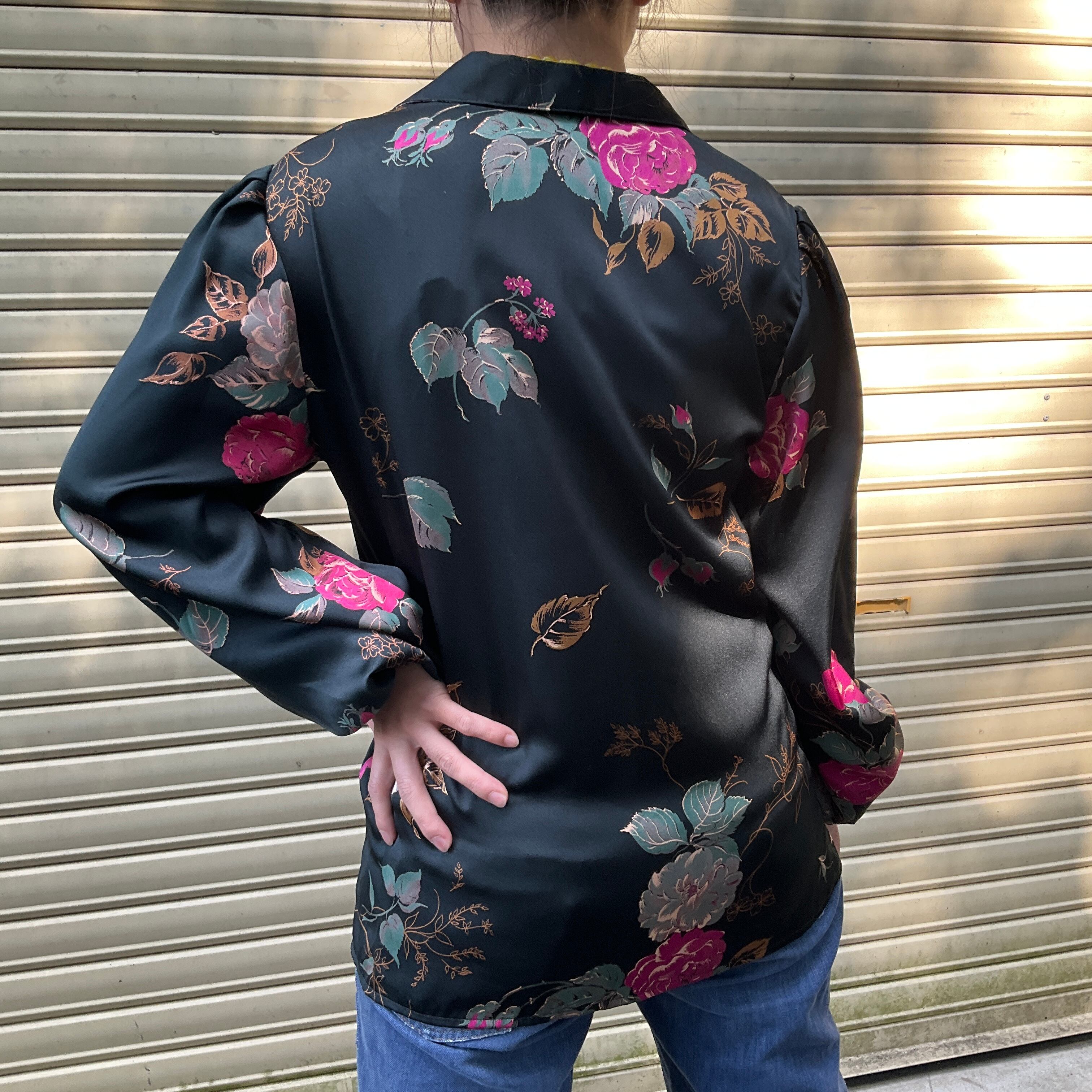 80年代 80s Pierre Lamonte 花柄 ボタニカル 総柄 バルーン袖 オープンカラー 長袖シャツ 古着 ヴィンテージ ビンテージ 開襟 ブラック 黒【f231030006】
