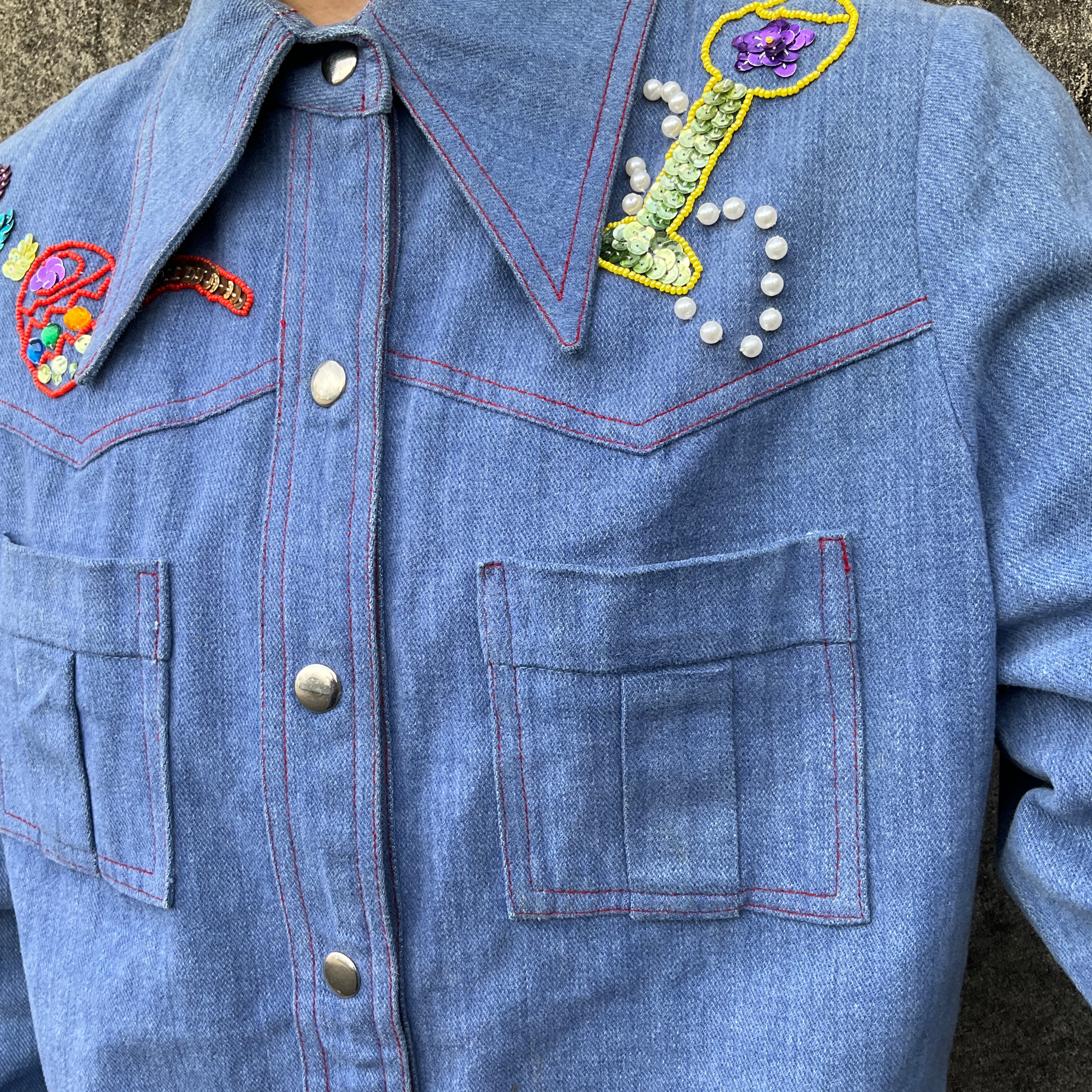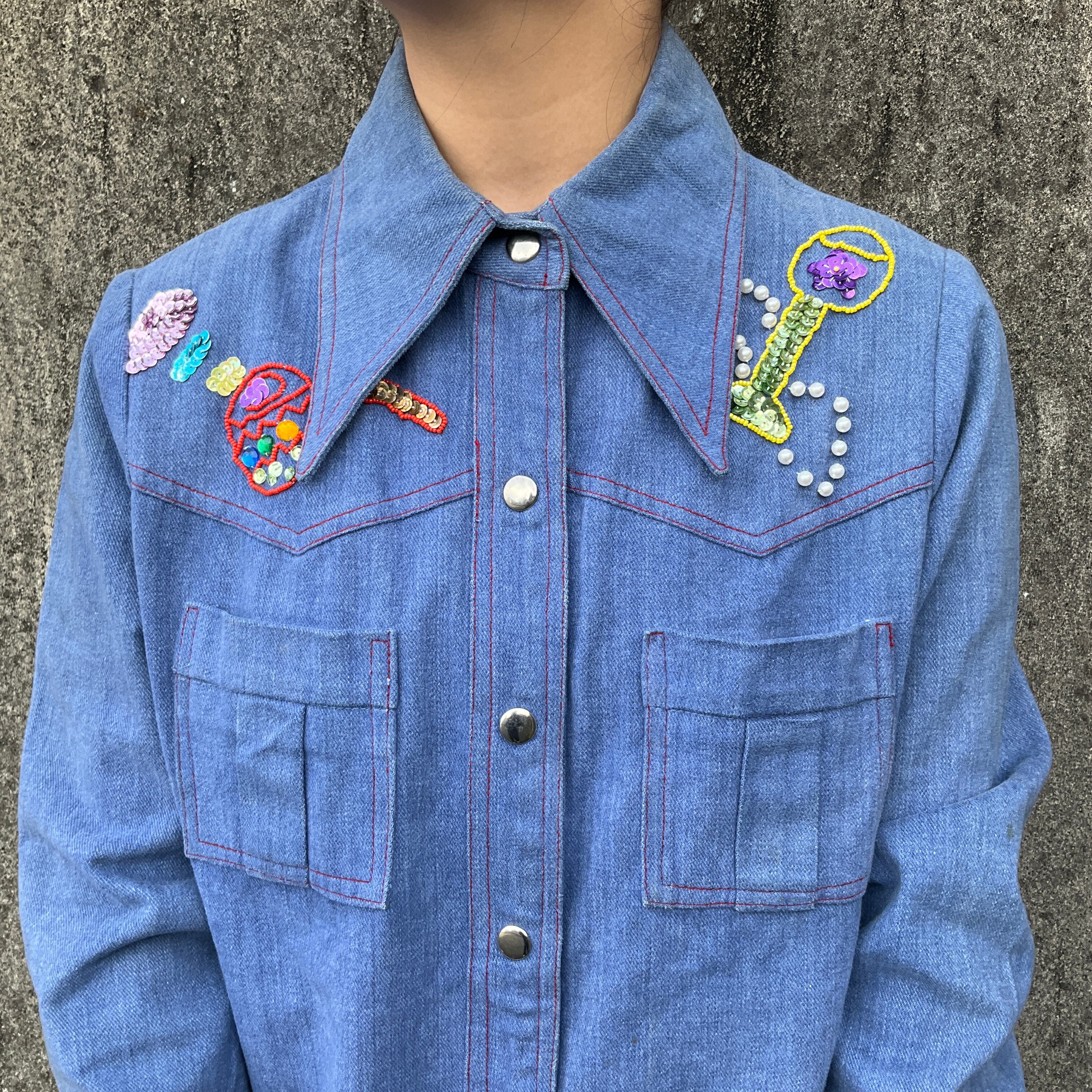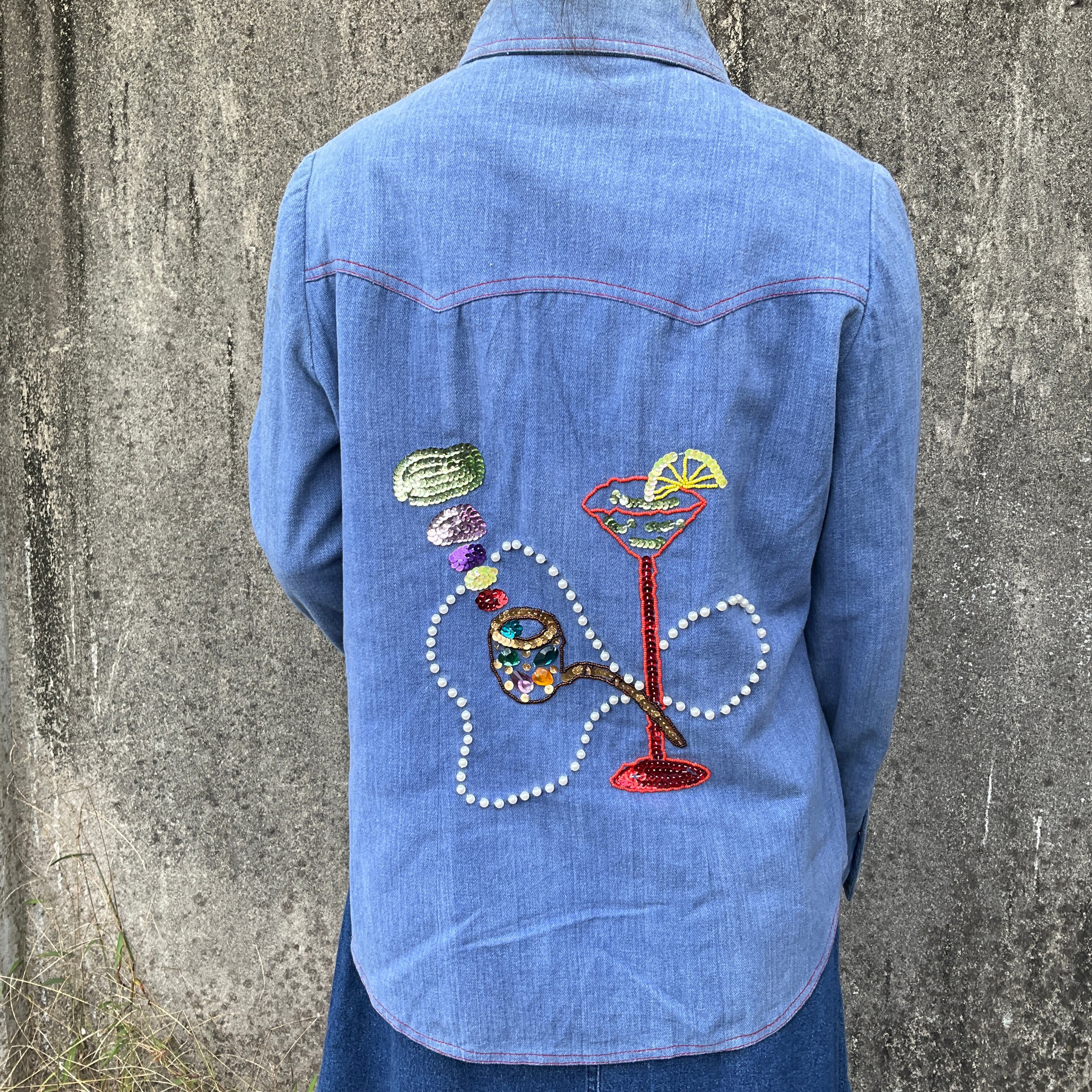 70年代 70s Shayne ビーズ パール 装飾 長袖シャツ ウエスタンシャツ 古着 ヴィンテージ ビンテージ レディース メンズ ライトブルー 水色【f231121006】