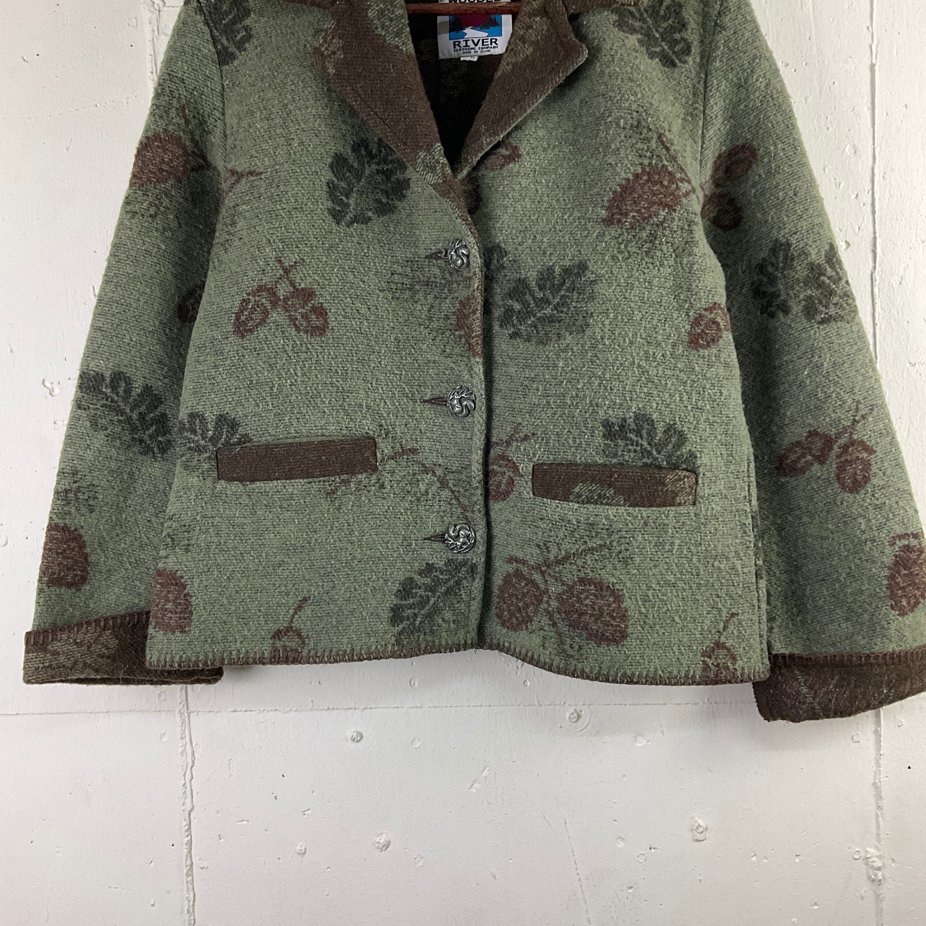 90年代 USA製 アイダホ WOOD RIVER ウッドリバーリス アニマル リーフ 総柄 ブランケットジャケット レディース 古着 グリーン 緑 ヴィンテージ ビンテージ 動物ボタン どんぐり【f231127007】