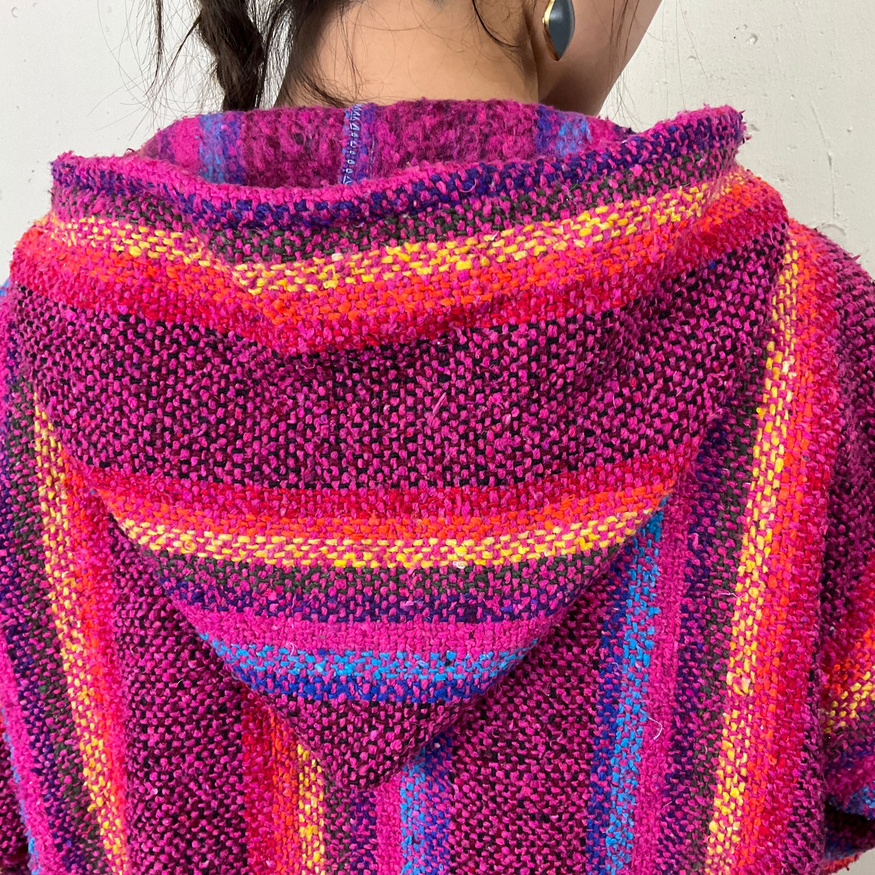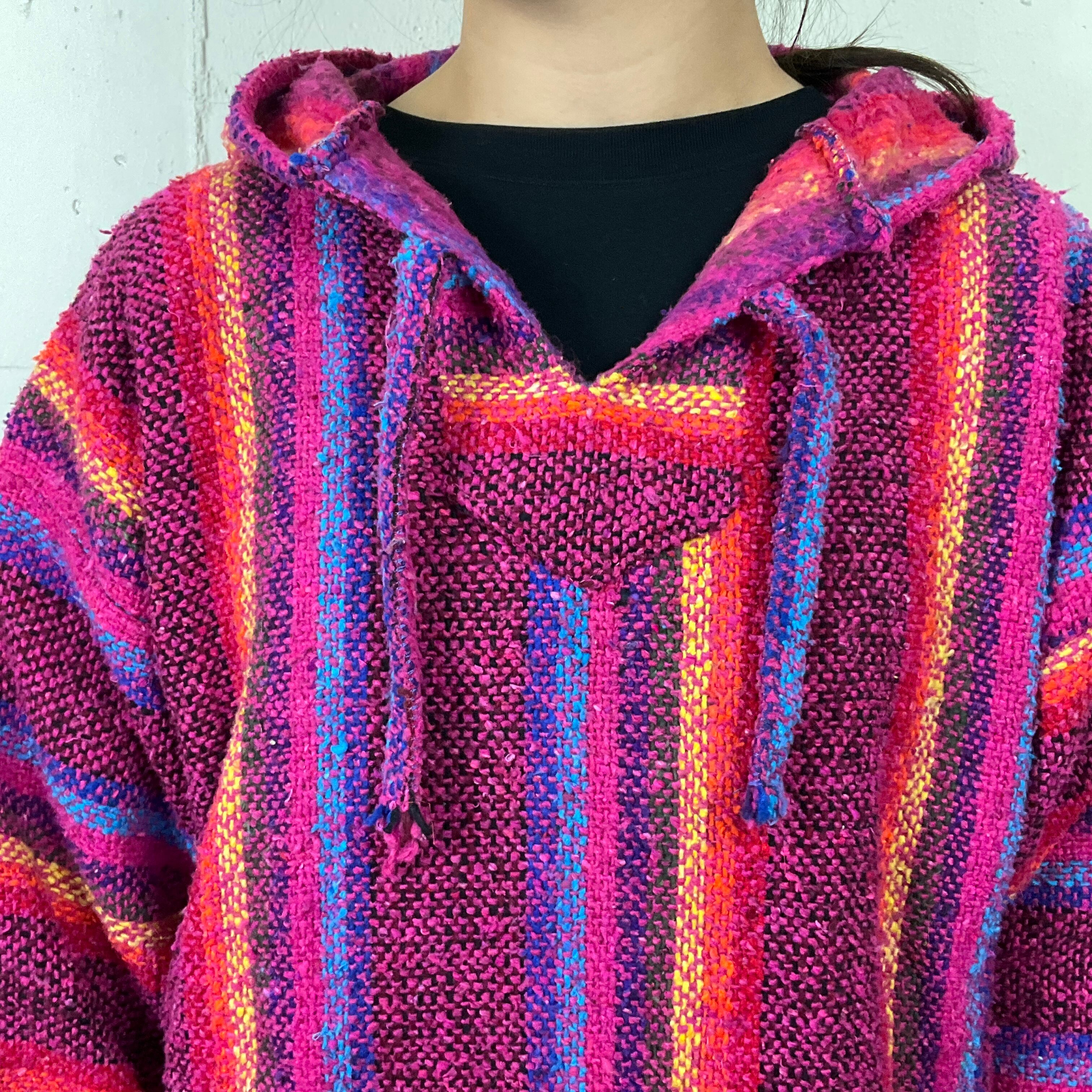 メキシコ製 LA MALINCHE ストライプ メキシカンパーカー フーディー メンズ レディース 古着 L ピンク【f231211003】