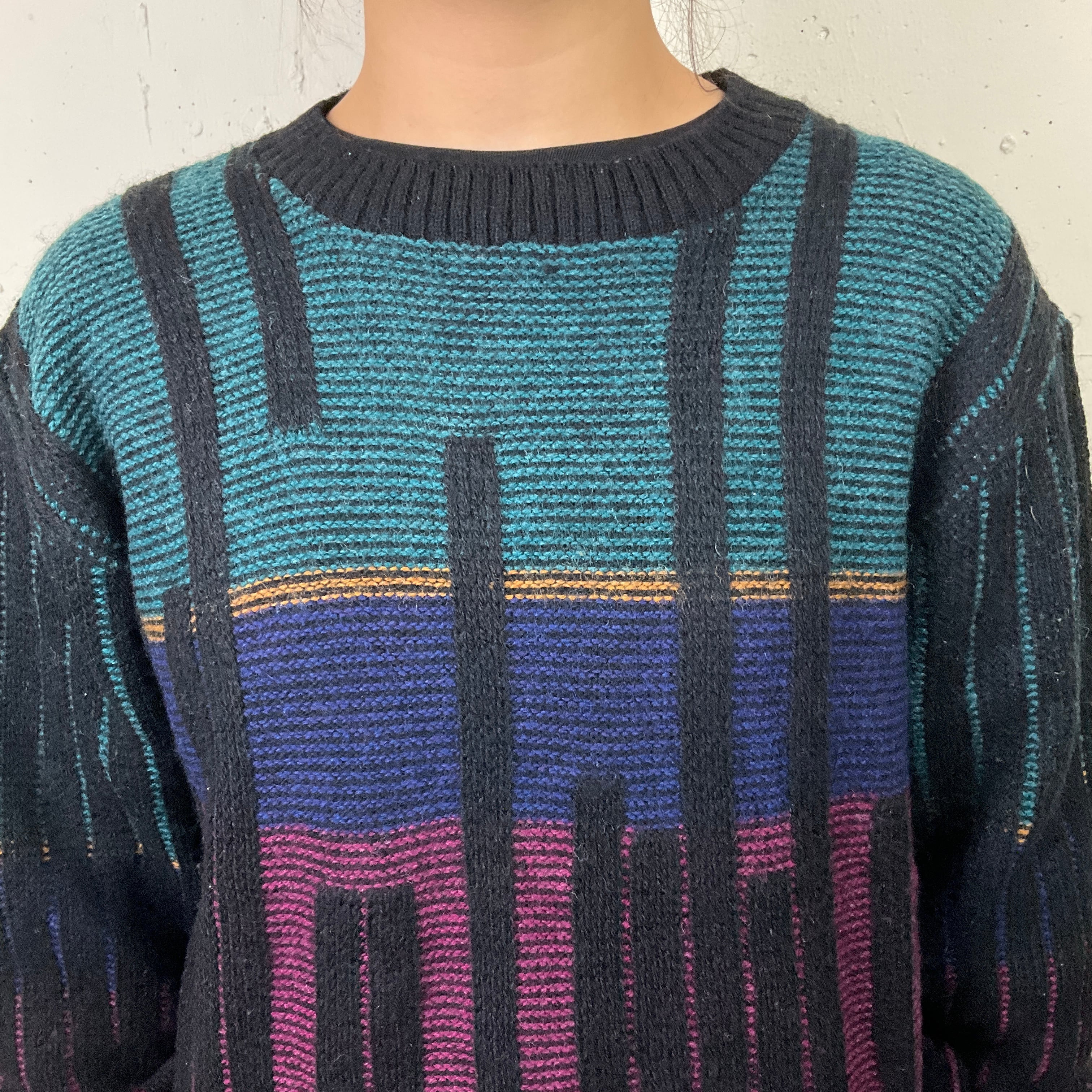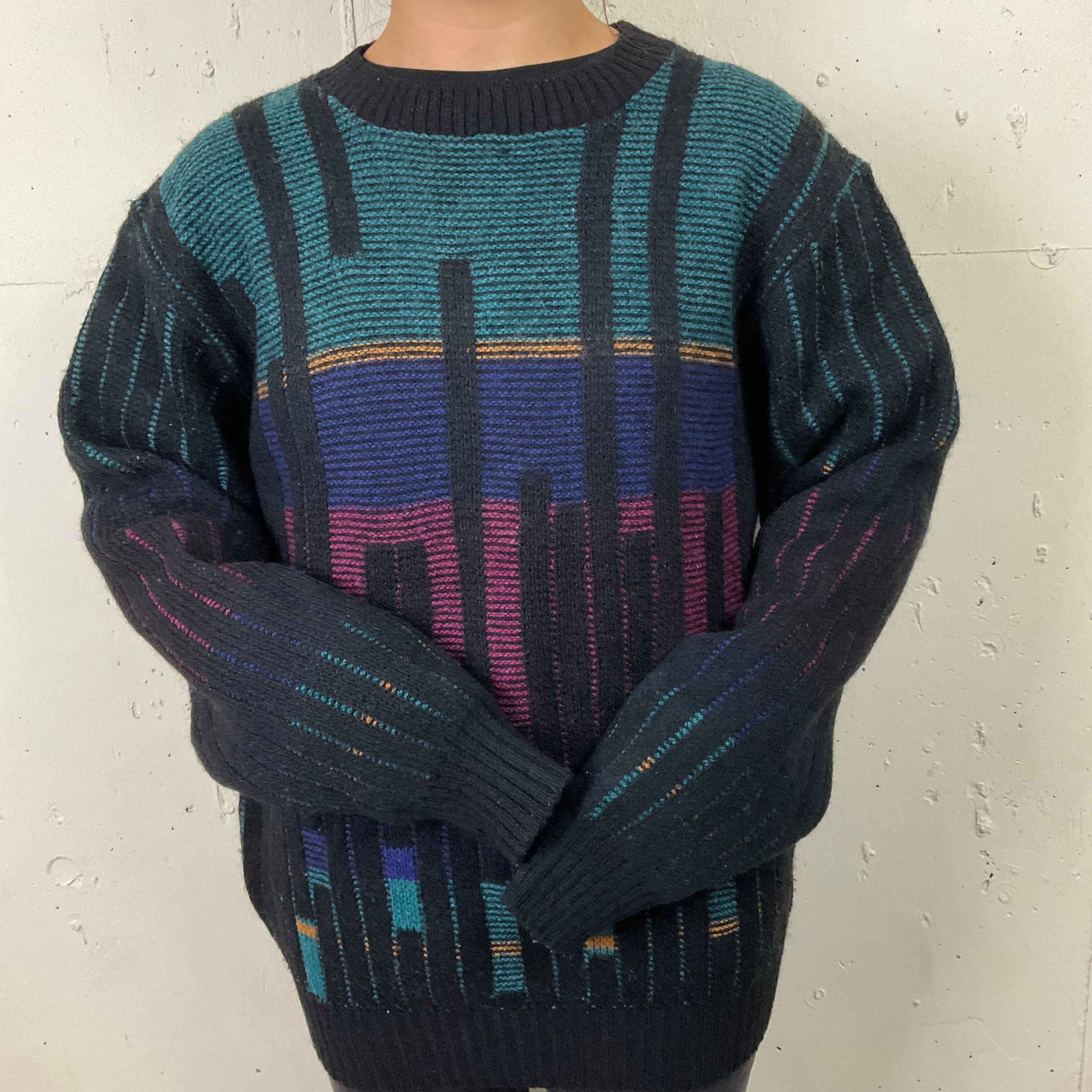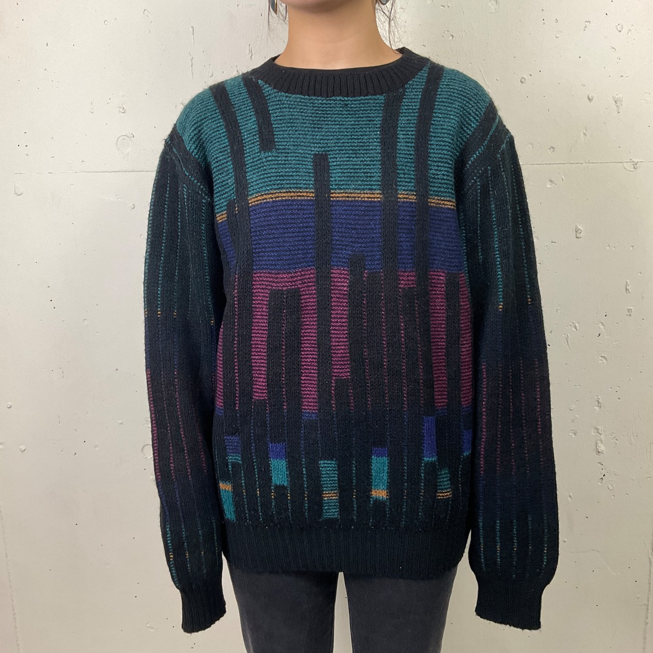 USA製 80年代 80s Jantzen ジャンセン 3D 立体編み ウール ニット セーター 古着 ヴィンテージ ビンテージ メンズM ブラック 黒 マルチカラー【f231211009】