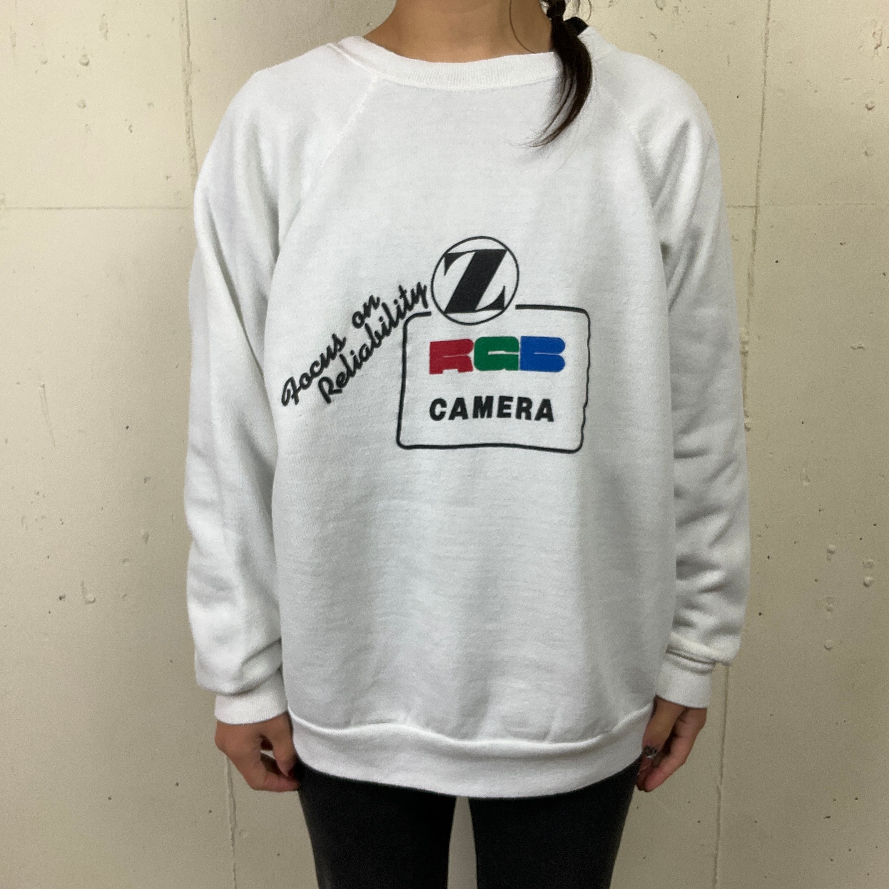 80年代 80s USA製 Z RGB CAMERA カメラ 企業 ロゴプリント スウェット トレーナー メンズL 古着 ホワイト 白 ラグランスリーブ ヴィンテージ ビンテージ【f231212022】