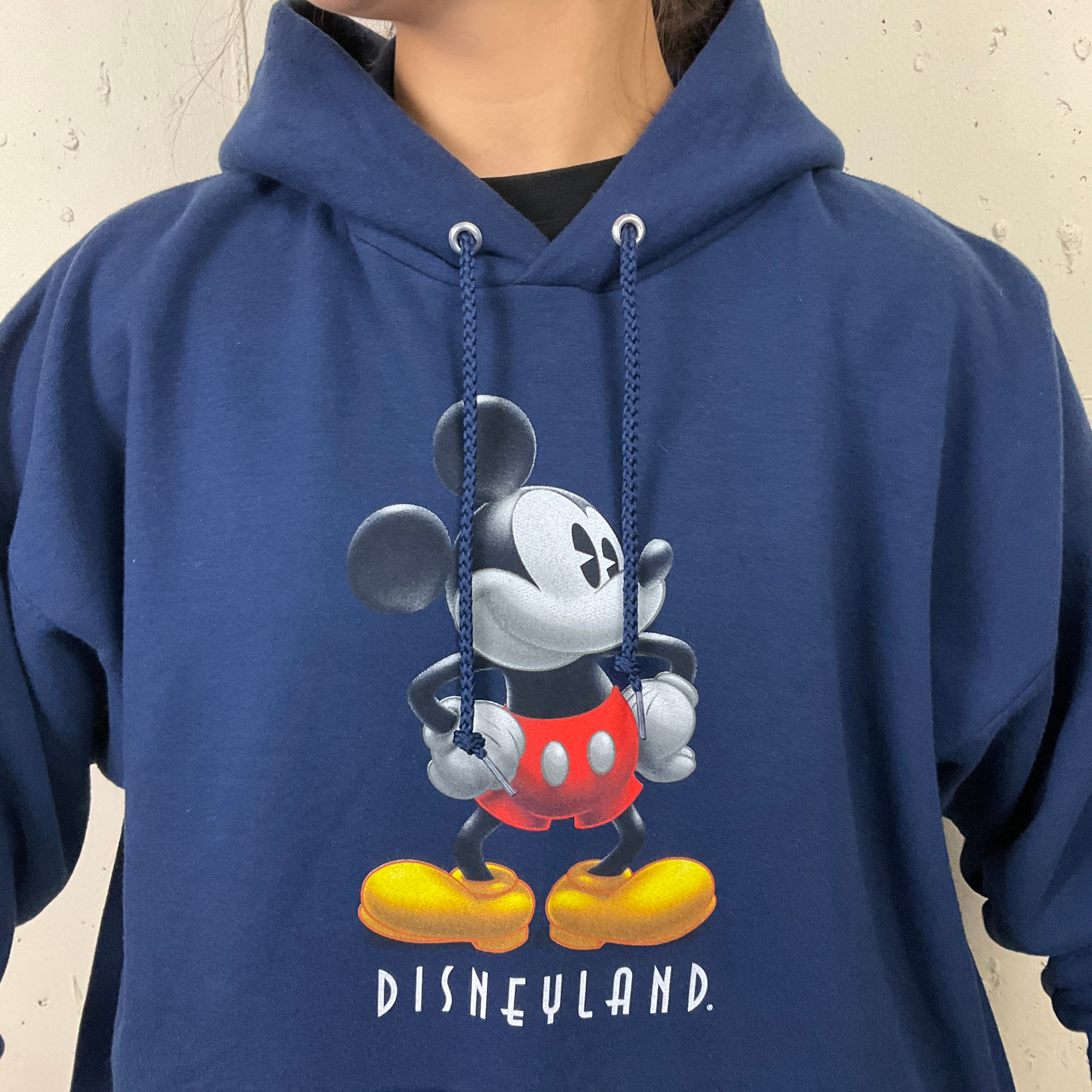 ディズニーランド ミッキーマウス キャラクター プリント スウェットパーカー フーディ メンズL レディース 古着 ネイビー 紺色 Disney ディズニー【f231214002】