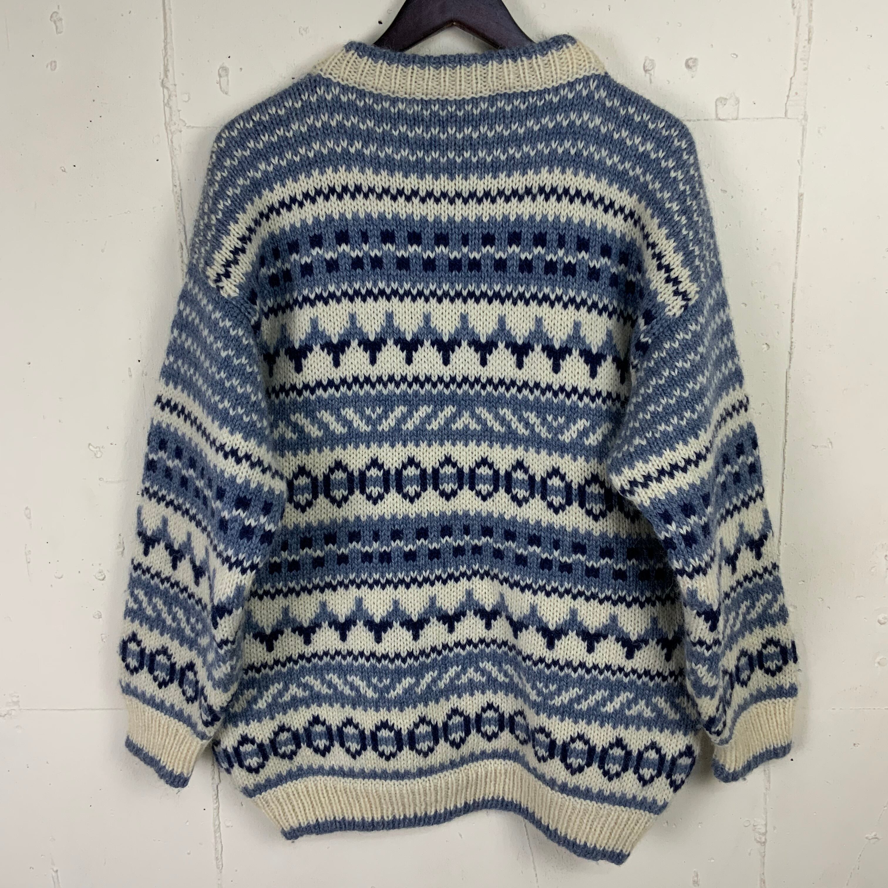 デンマーク製 SOTOBI ソトビ ウール ノルディック ニット セーター 古着 ホワイト×ブルー 白 青系 メンズL レディース フェアアイル 総柄【f231214017】