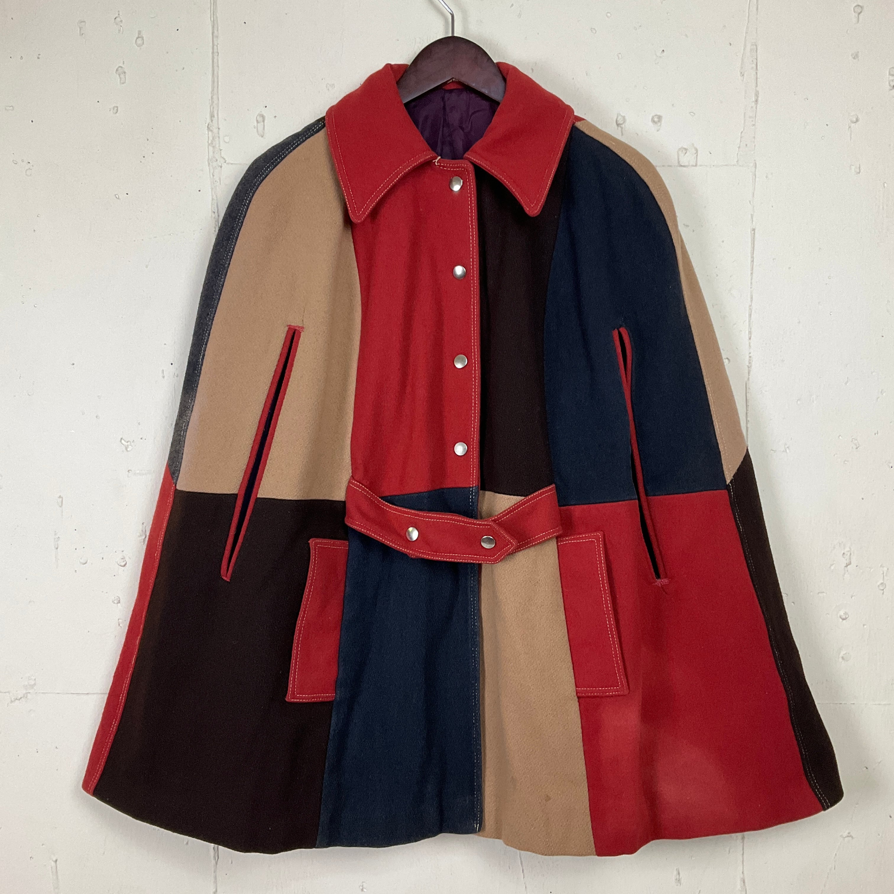 70年代 70s クレイジーパターン ウール ポンチョ ケープ コート 古着 ヴィンテージ ビンテージ レディース 【f240205009】