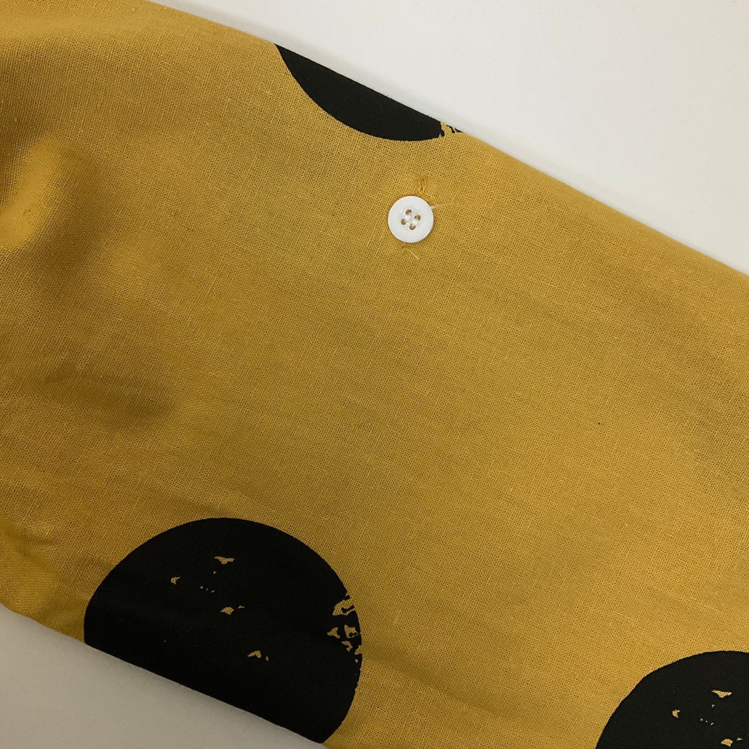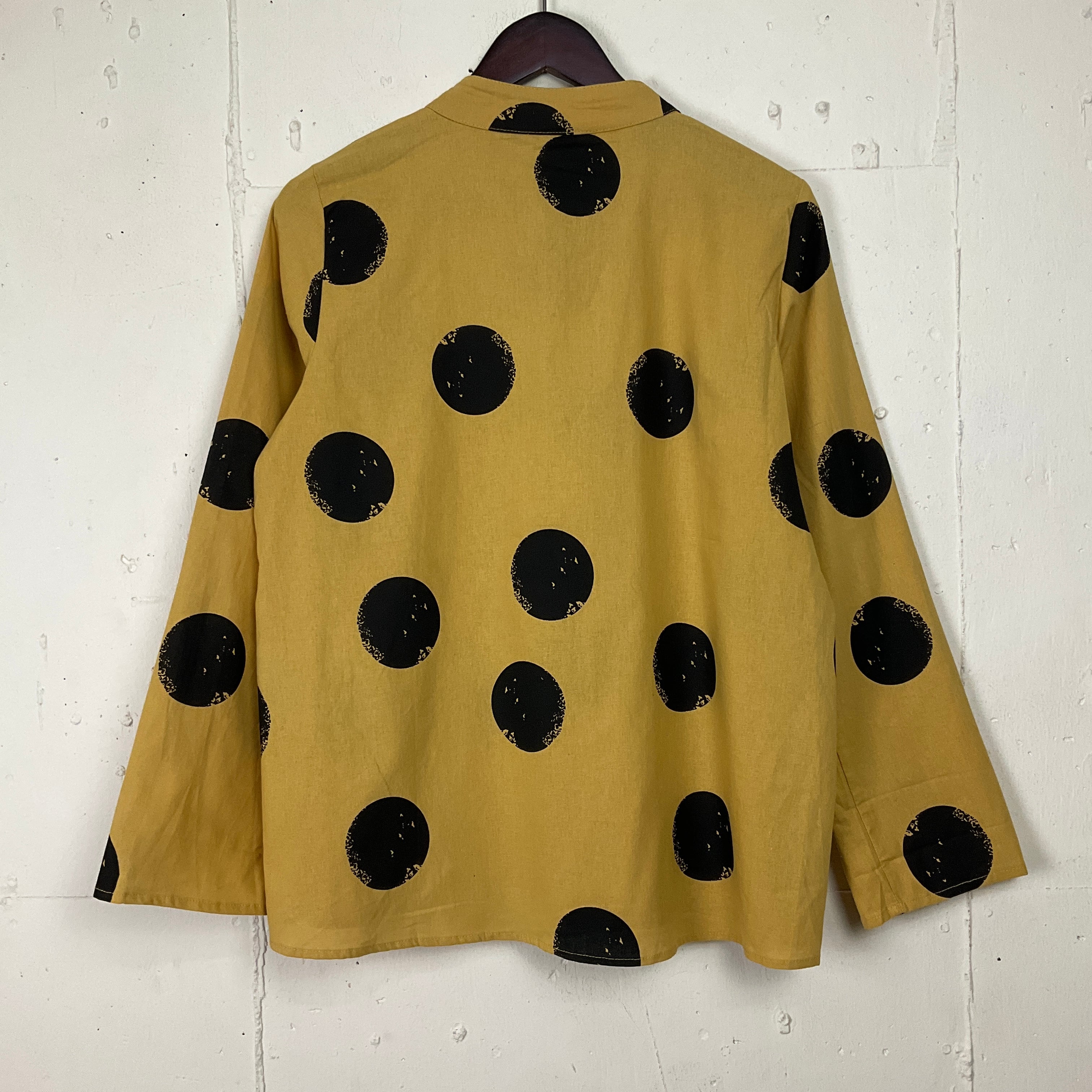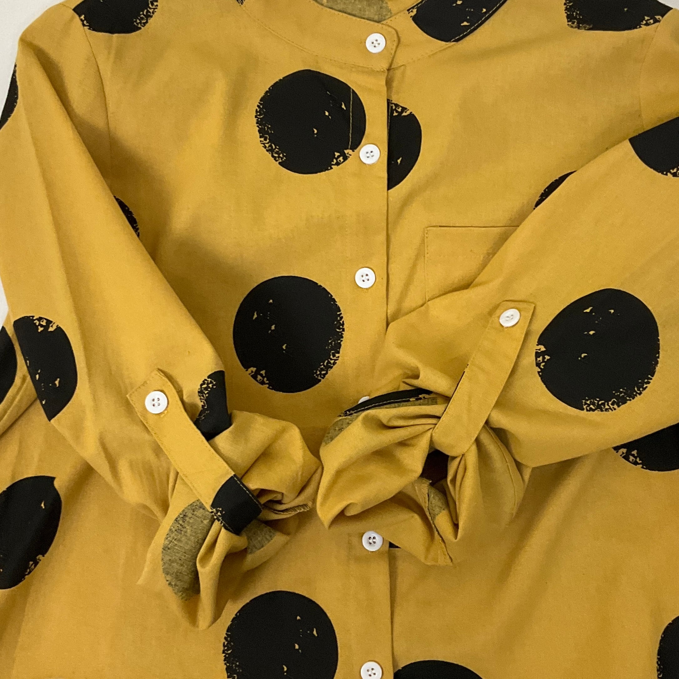 水玉 ドット 総柄 ノーカラー デザイン 長袖シャツ 古着 レディースL からし色 黄色 イエロー【f240212011】