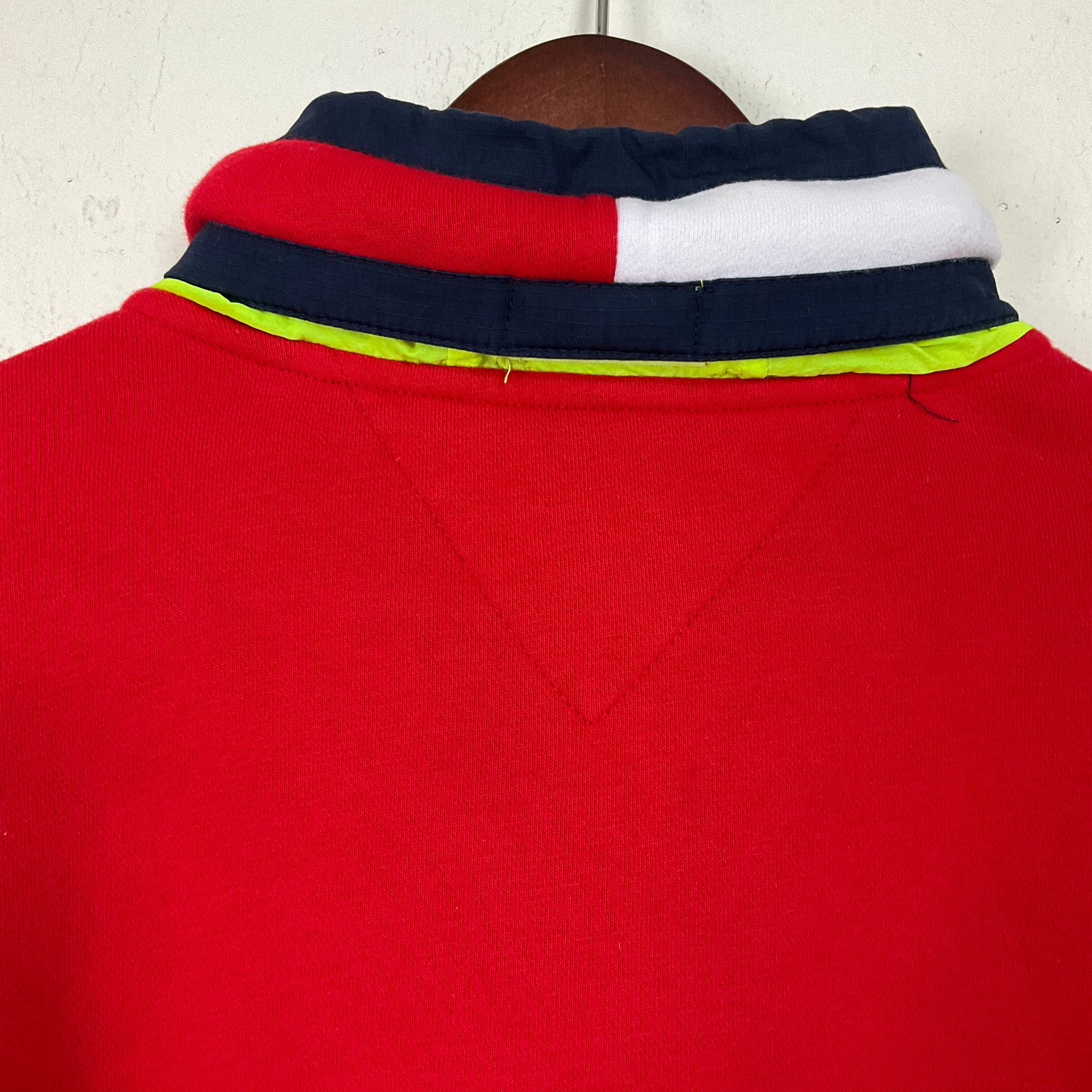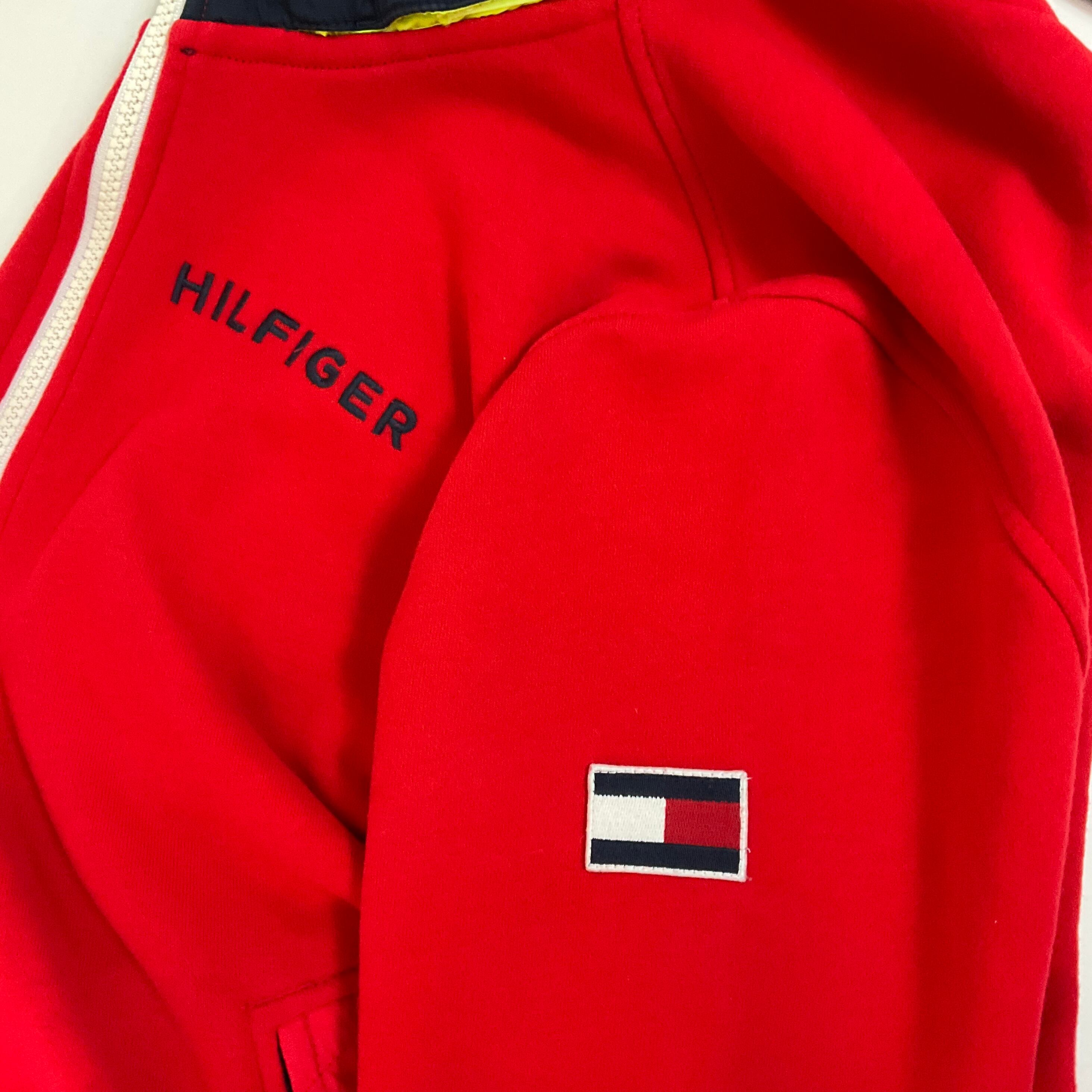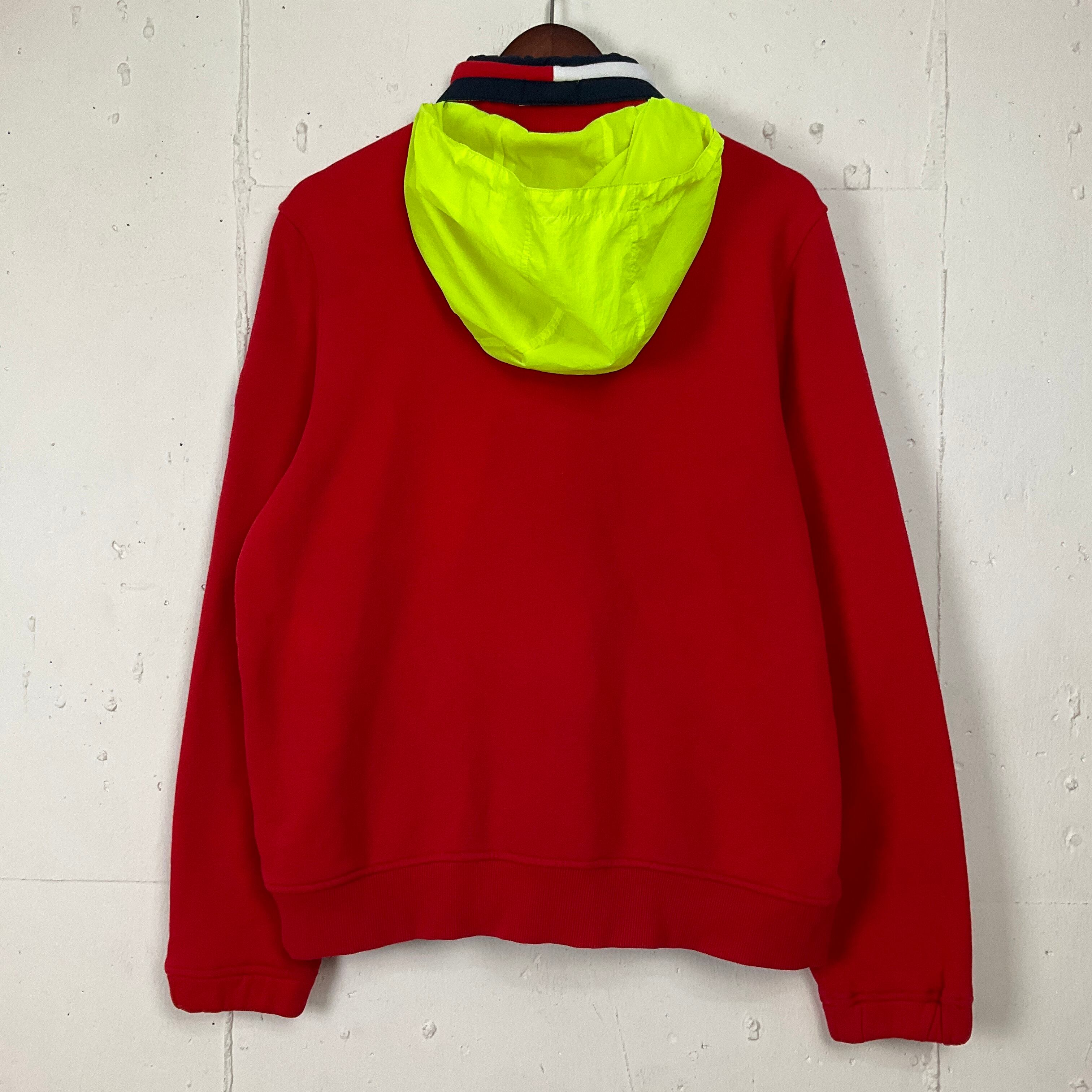 TOMMY HILFIGERトミーヒルフィガー ハーフジップ スウェット メンズM 古着 ロゴ刺繍 フード収納型 レッド 赤【f240213009】