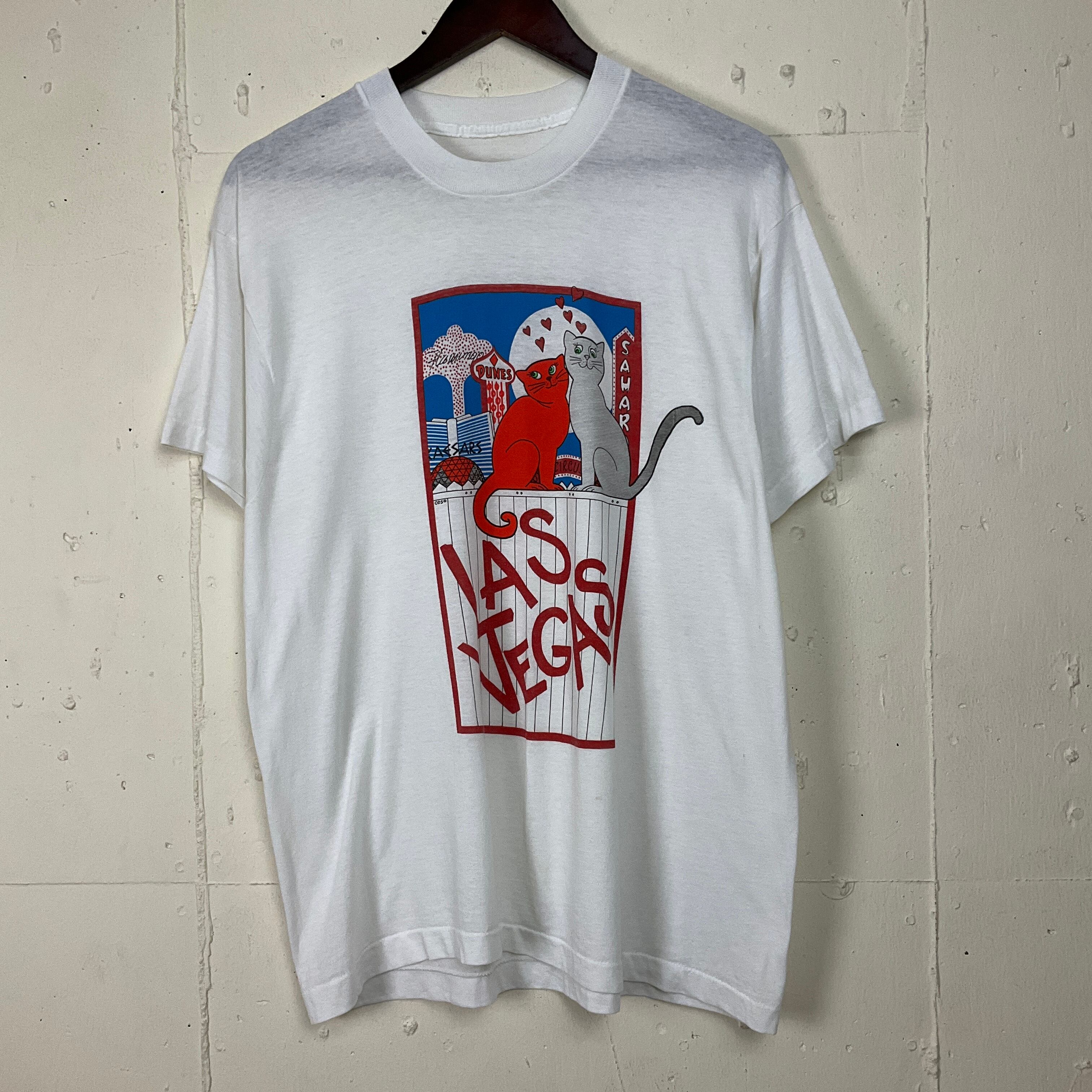 80年代 80s LASVEGAS 猫 ねこ プリント Tシャツ 古着 ヴィンテージ ビンテージ メンズL相当 レディース ホワイト 白 シングルステッチ 【f240220010】