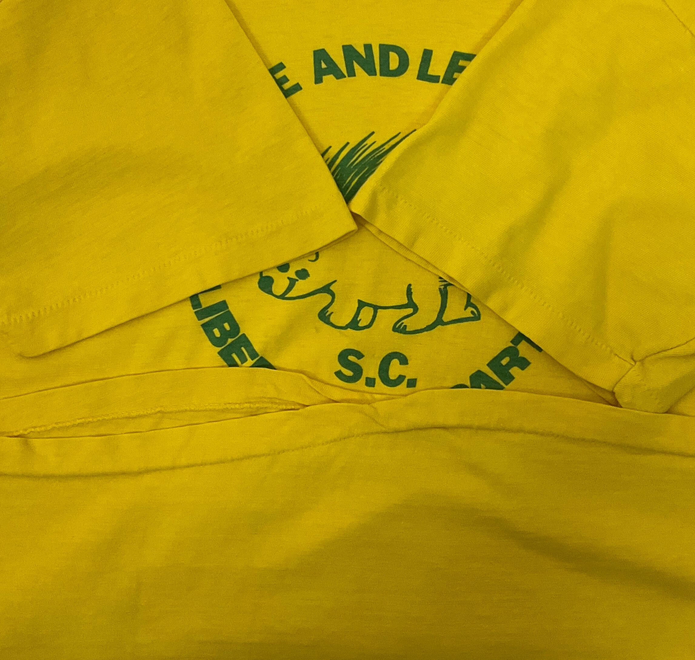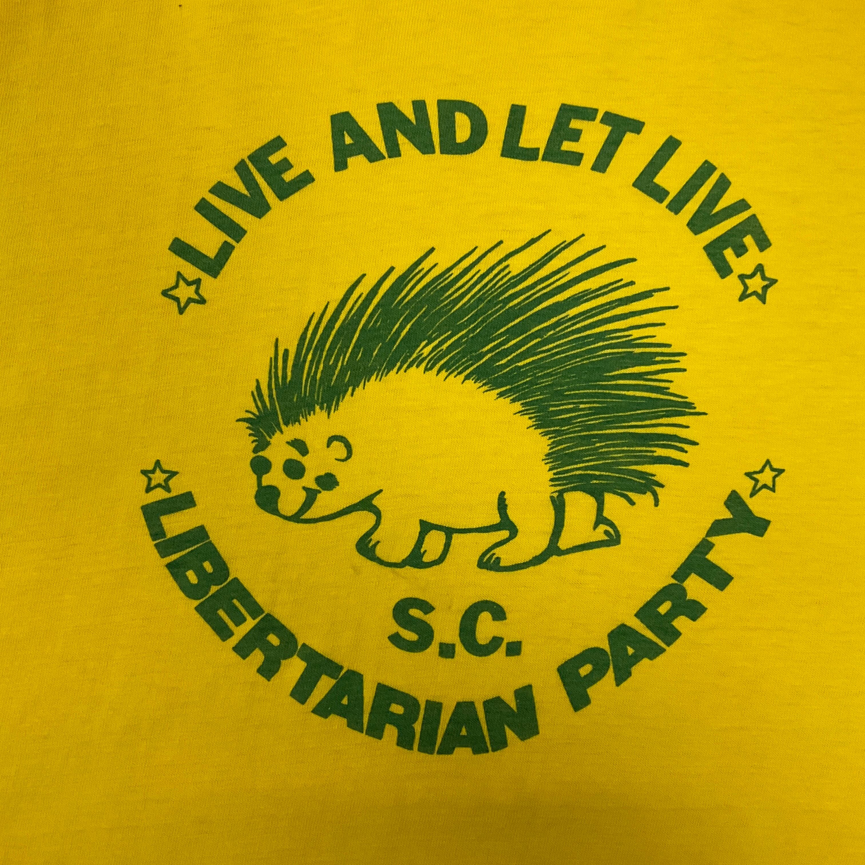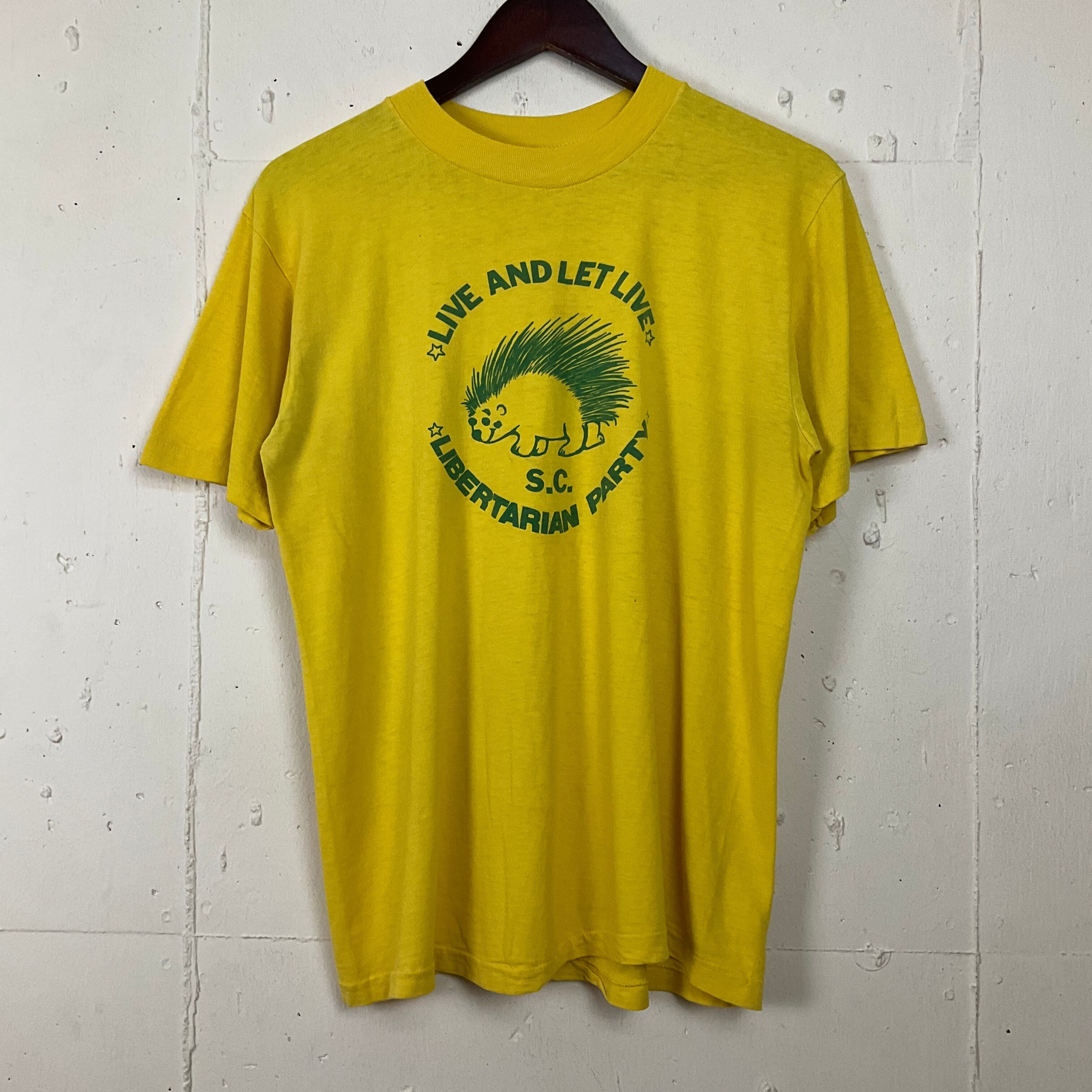 USA製 80年代 80s LIBERTARIAN PARTY 政党 アニマル プリント Tシャツ 古着 メンズL相当 イエロー 黄色 シングルステッチ ヴィンテージ ビンテージ【f240328033】