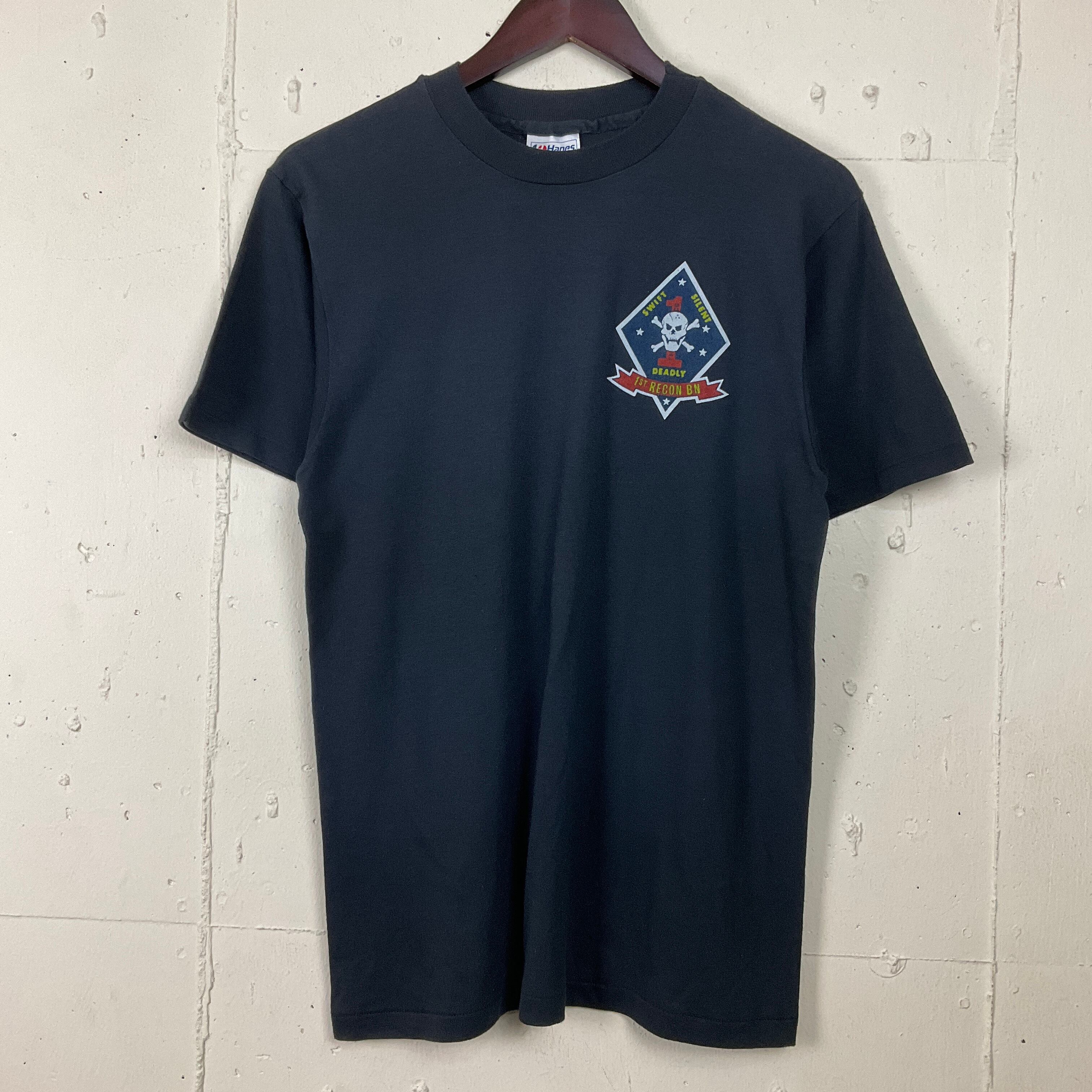 USA製 80年代 80s 1st RECON BN ミリタリー ロゴ プリント Tシャツ 古着 メンズM ブラック 黒 シングルステッチ ヴィンテージ ビンテージ アメリカ海兵隊 スカル 髑髏【f240328034】