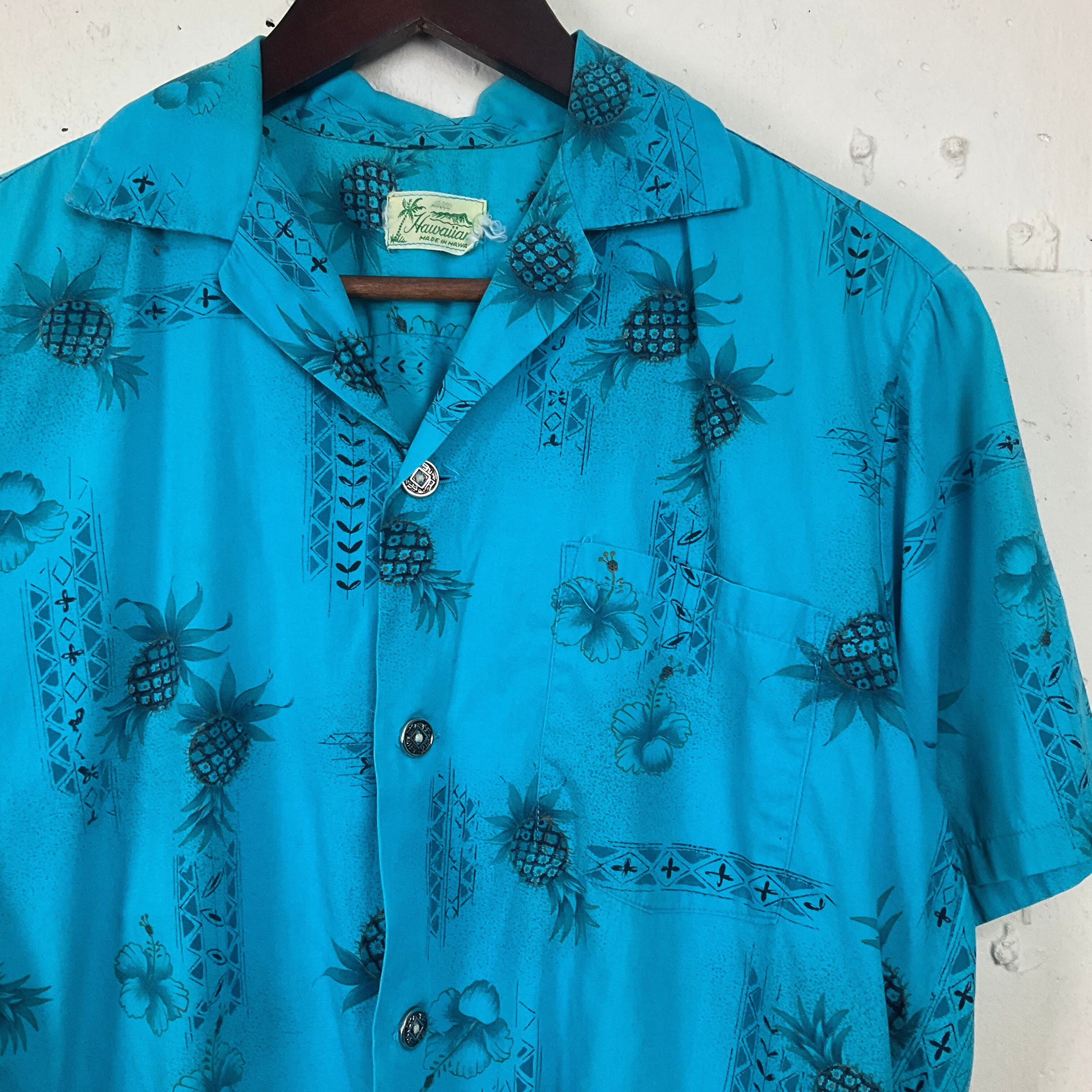 ハワイ製 60年代 60s パイナップル ハイビス 開襟 アロハシャツ 古着 ヴィンテージ ビンテージ メンズL相当 半袖シャツ ライトブルー 水色【f240403017】