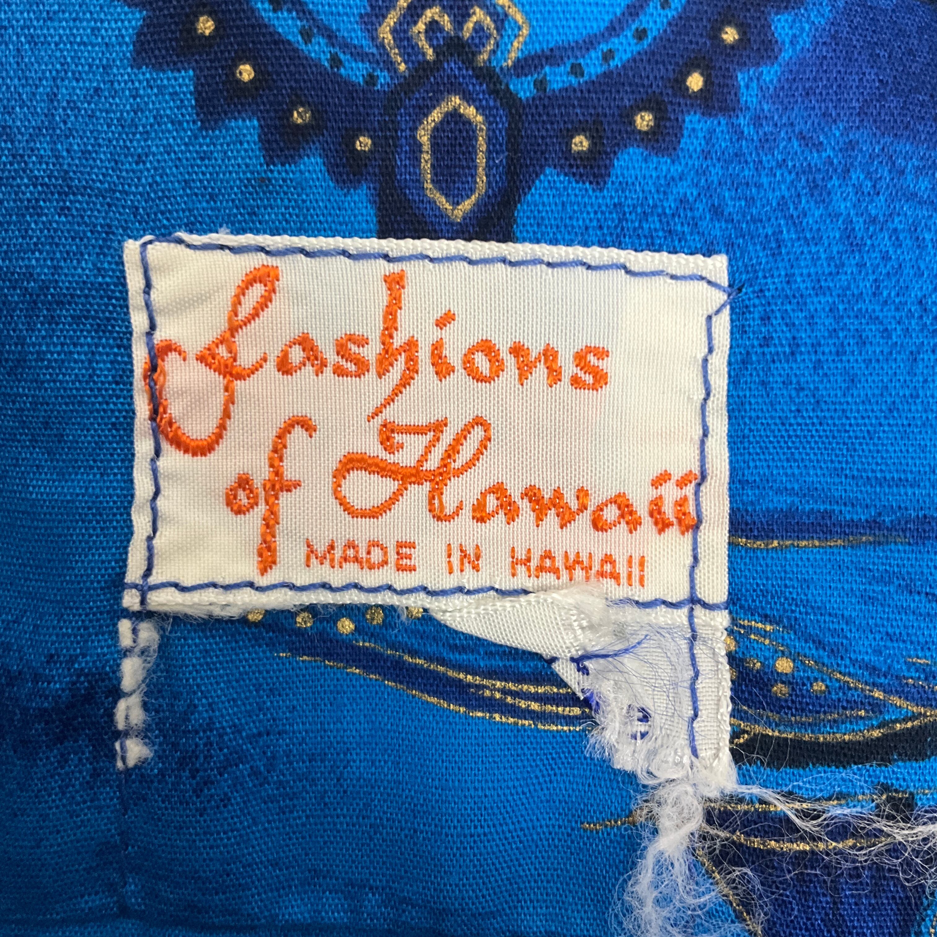 ハワイ製 60年代 60s 魚 ハイビス 開襟 アロハシャツ 古着 ヴィンテージ ビンテージ メンズXL相当 半袖シャツ ブルー 青色【f240403018】
