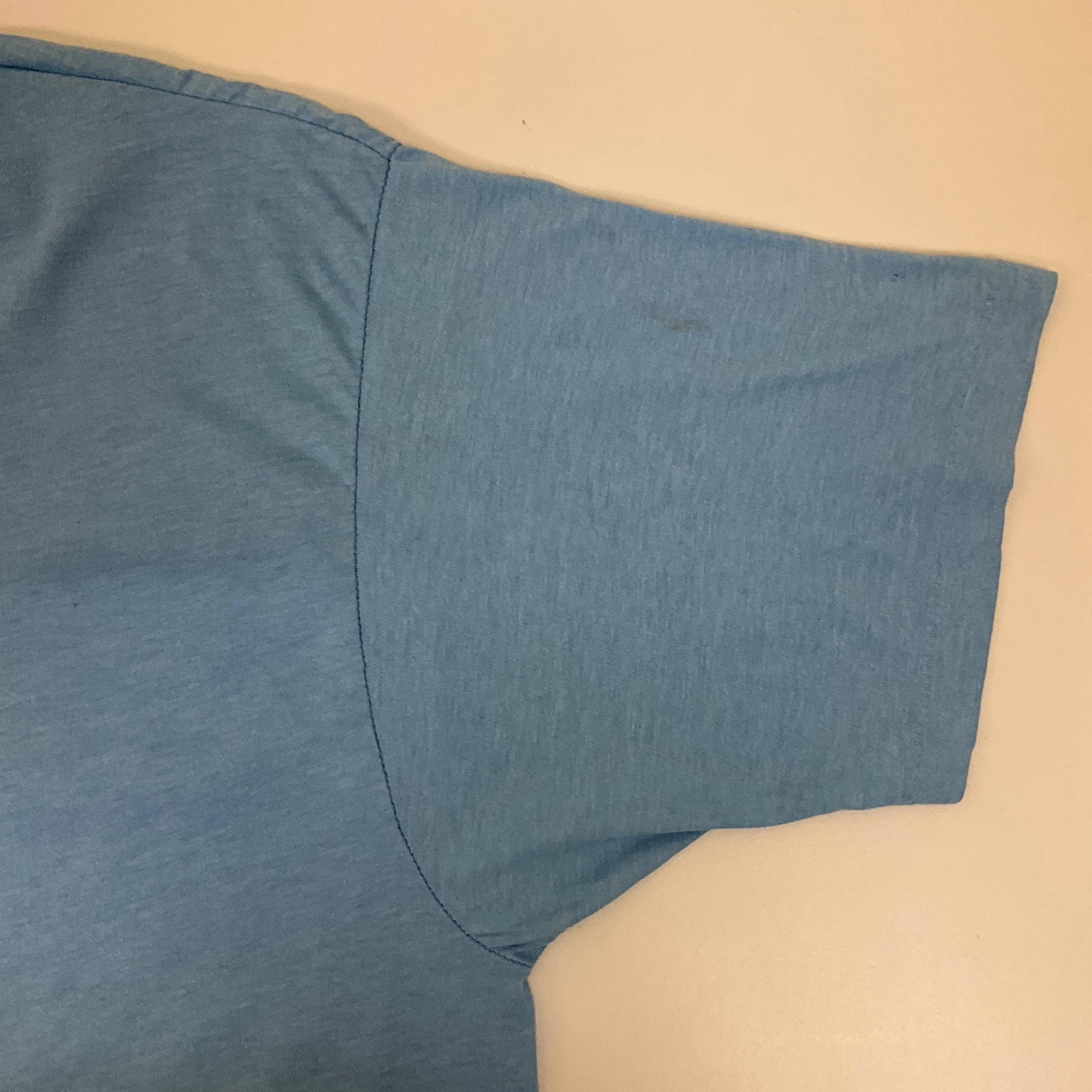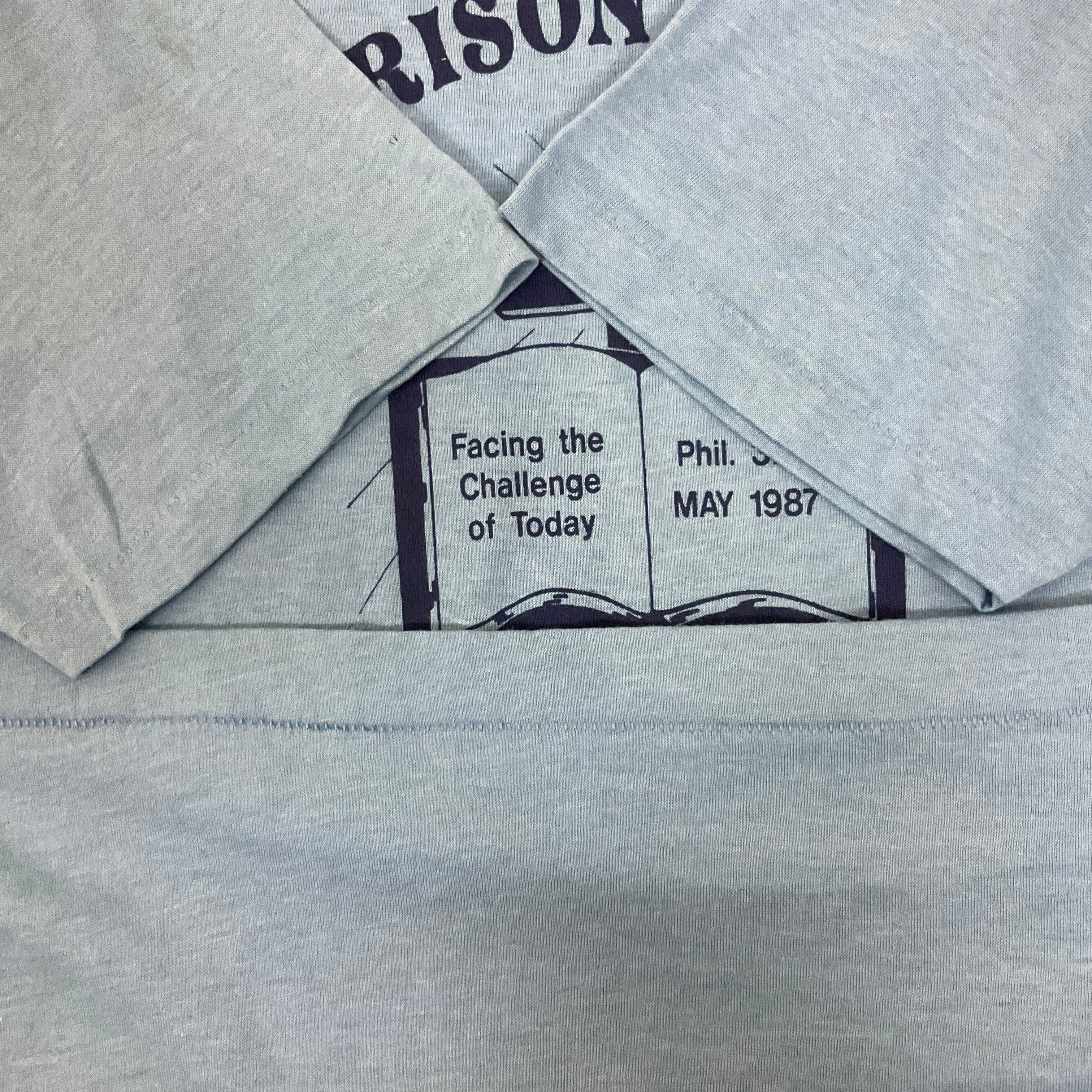 USA製 80年代 80s BAPTIST CHURCH 協会 染み込み プリントTシャツ 古着 ヴィンテージ ビンテージ メンズL 水色 ライトブルー シングルステッチ【f240503027】