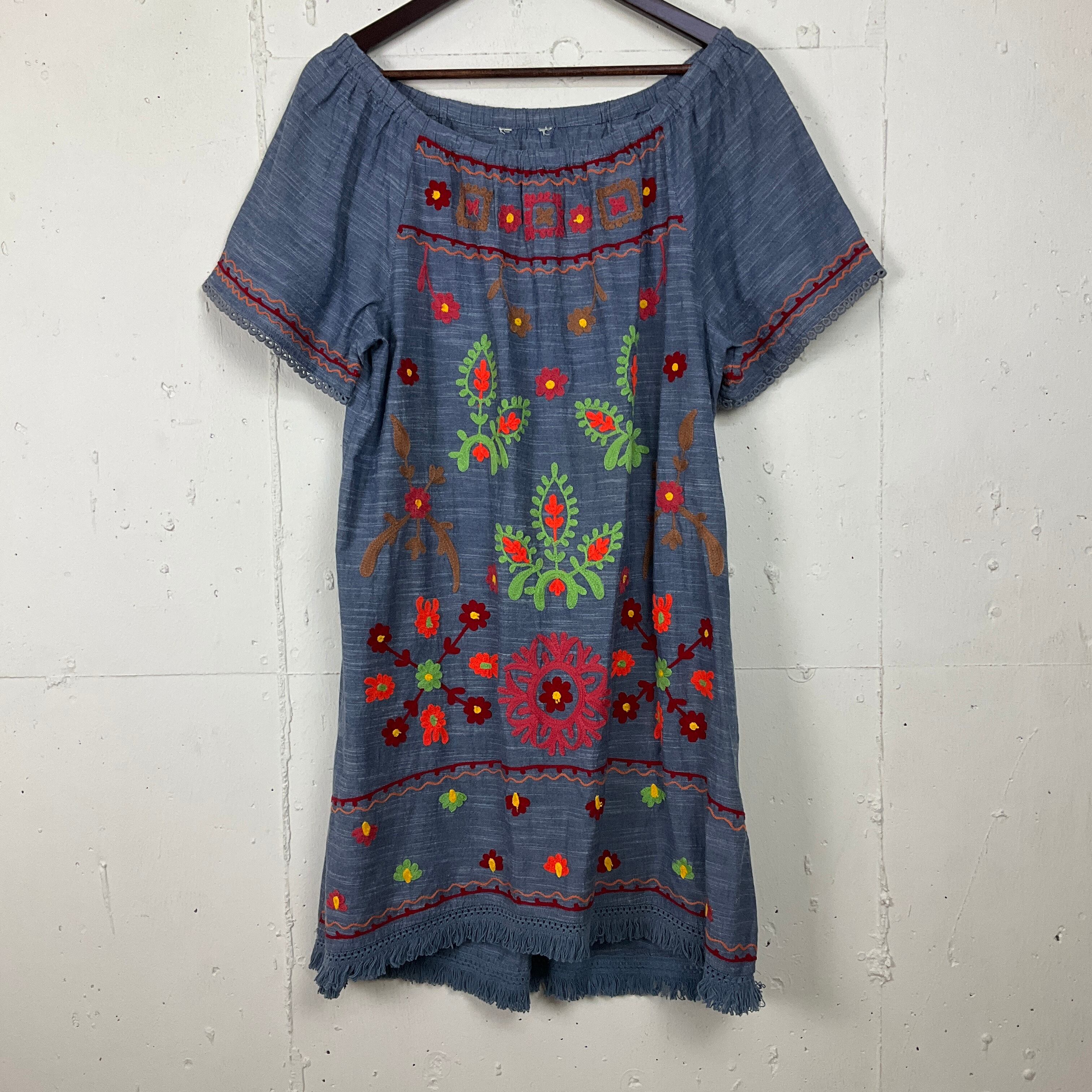 半袖 花刺繍 オフショルダー ワンピース レディースM相当 古着 グレー【f240515012】