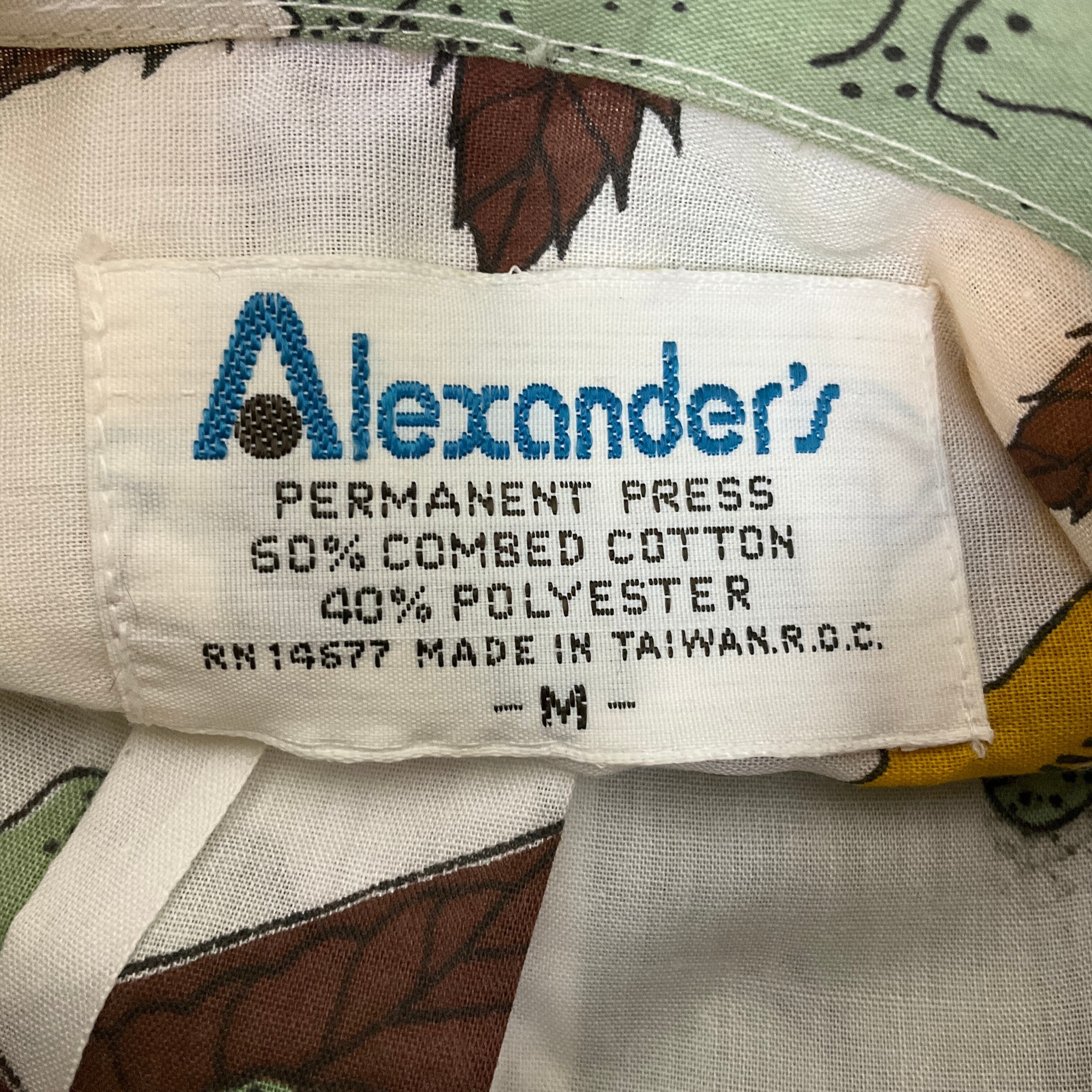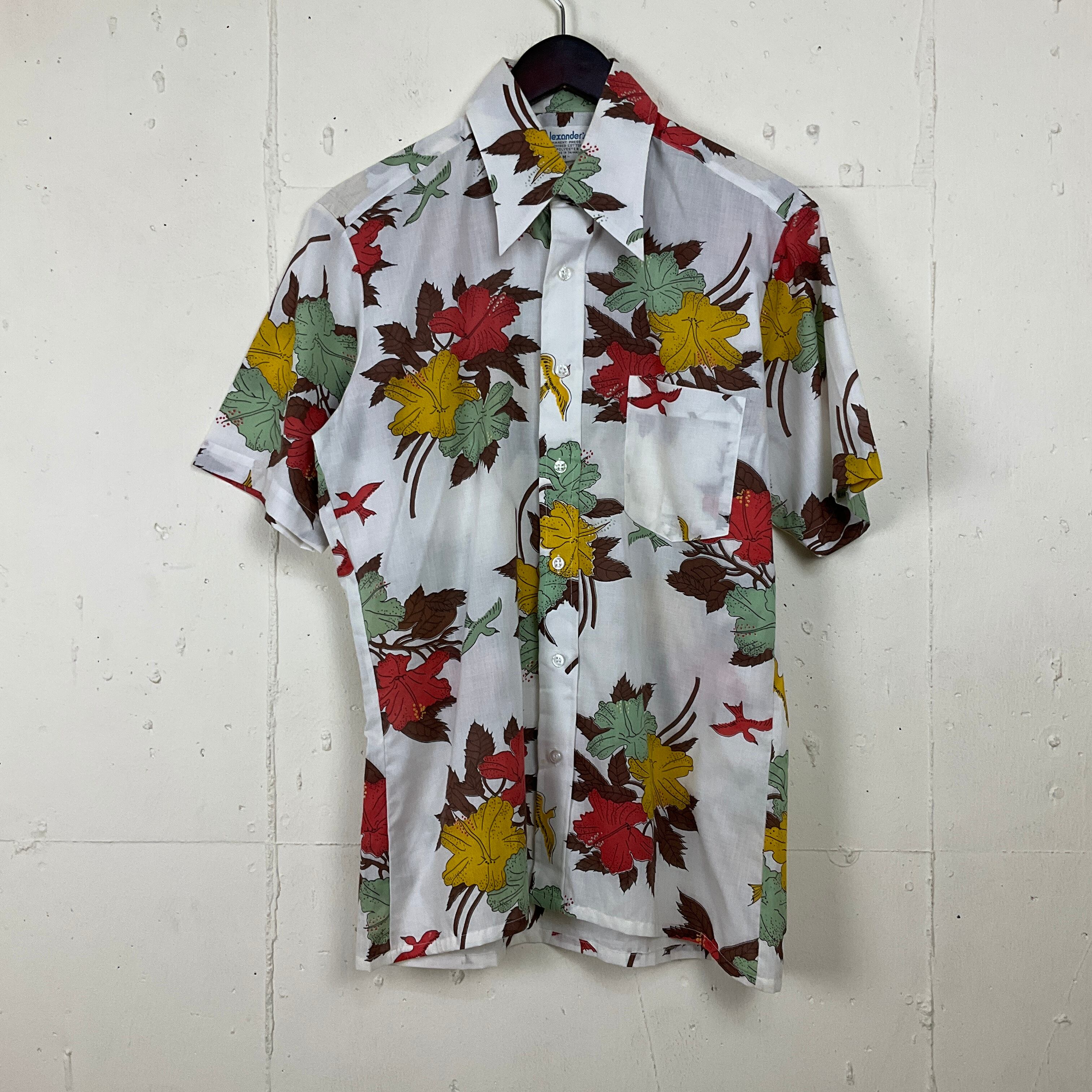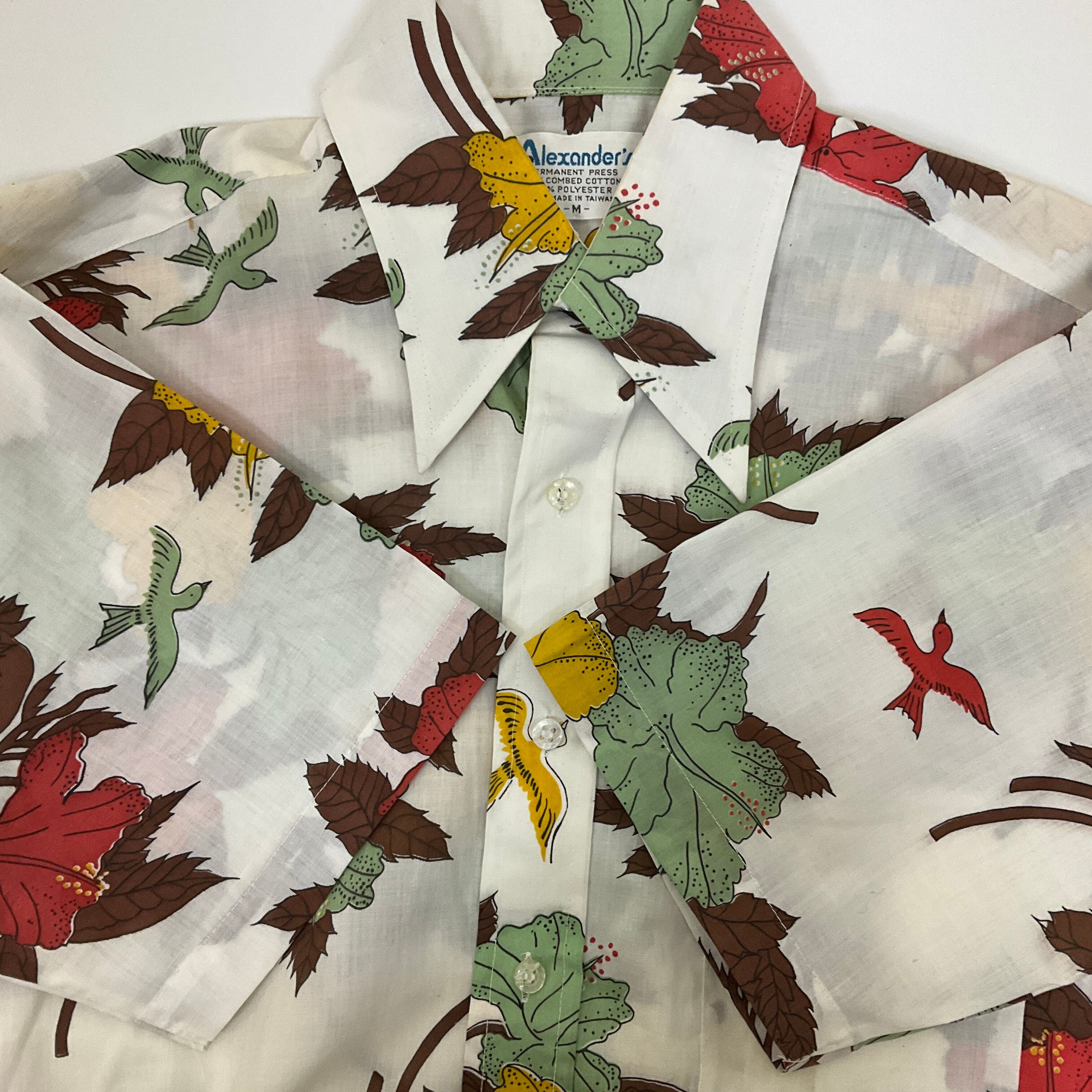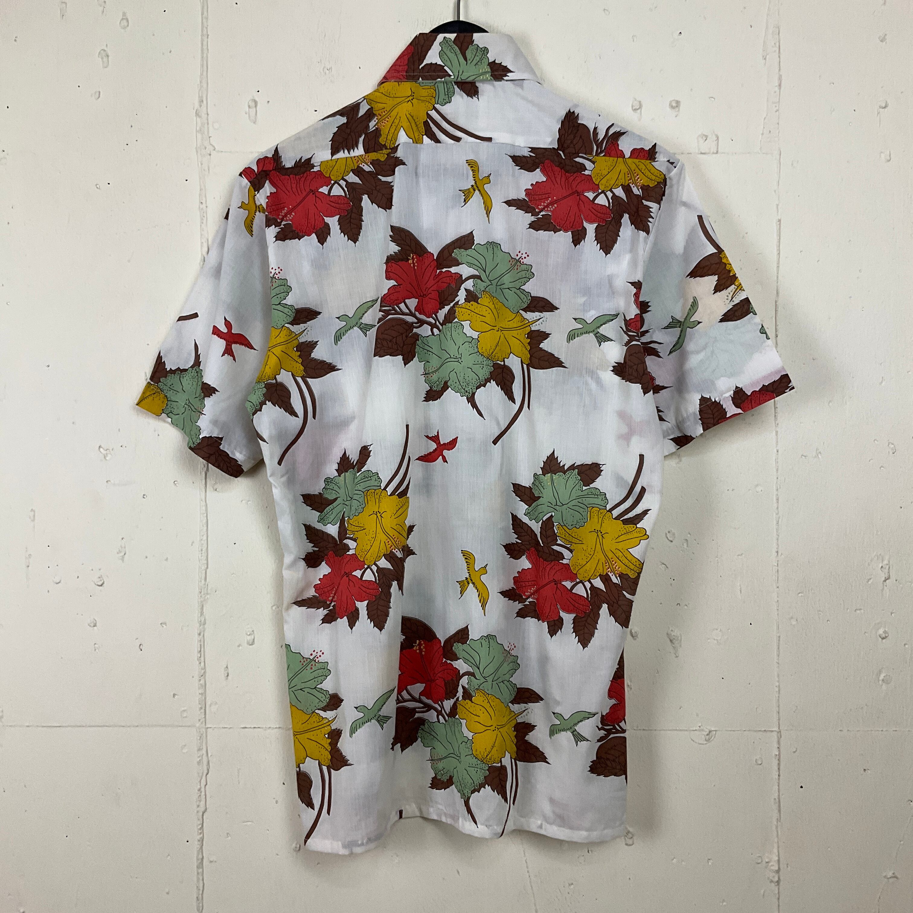 70年代 70s Alexandbr's 花 鳥 総柄 半袖シャツ ボックスシャツ 古着 ヴィンテージ ビンテージ メンズM ホワイト 白【f240517005】