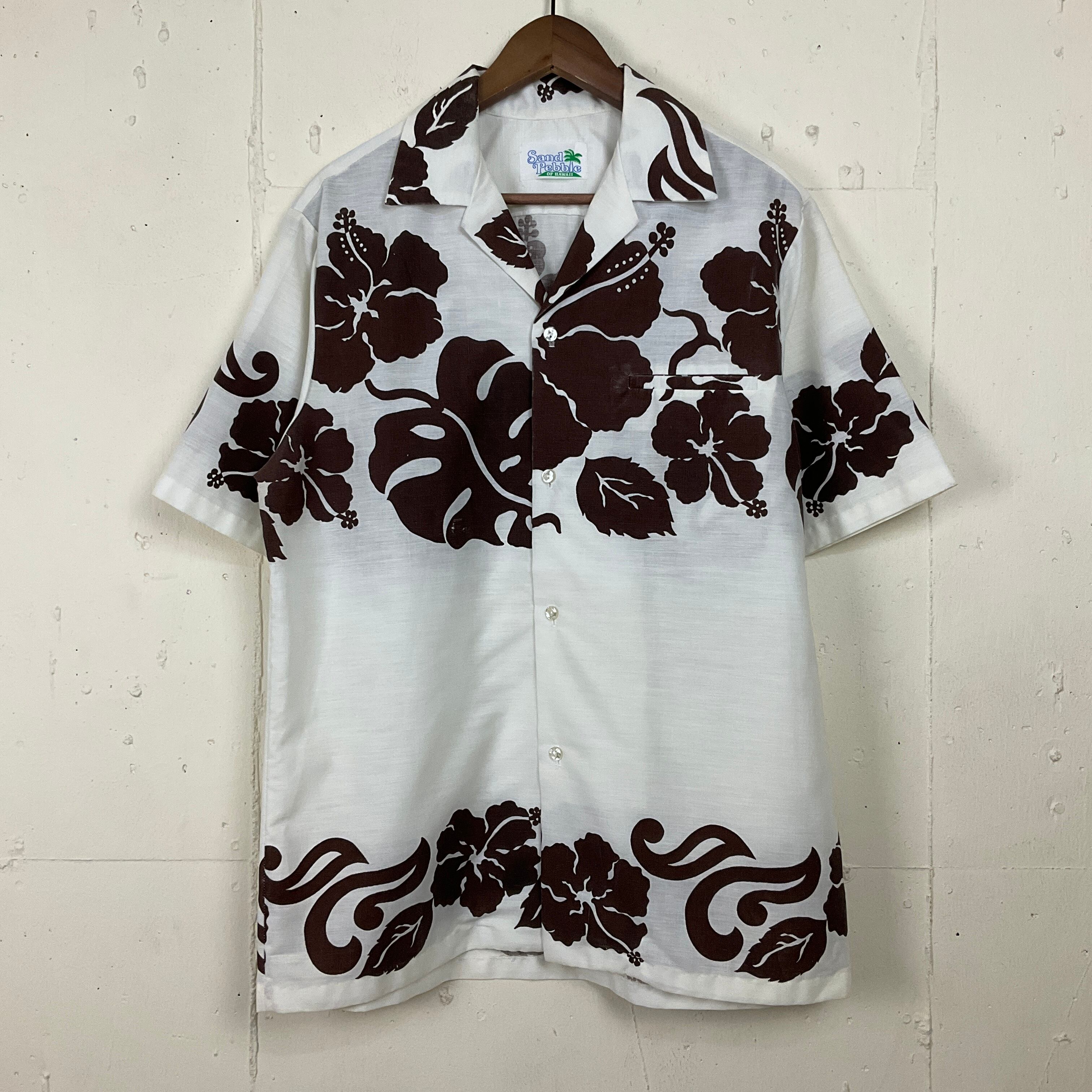 70年代 70s ハイビス 花 開襟 オープンカラー アロハシャツ 半袖シャツ 古着 ヴィンテージ ビンテージ メンズL相当 ホワイト×ブラウン 白【f240517024】