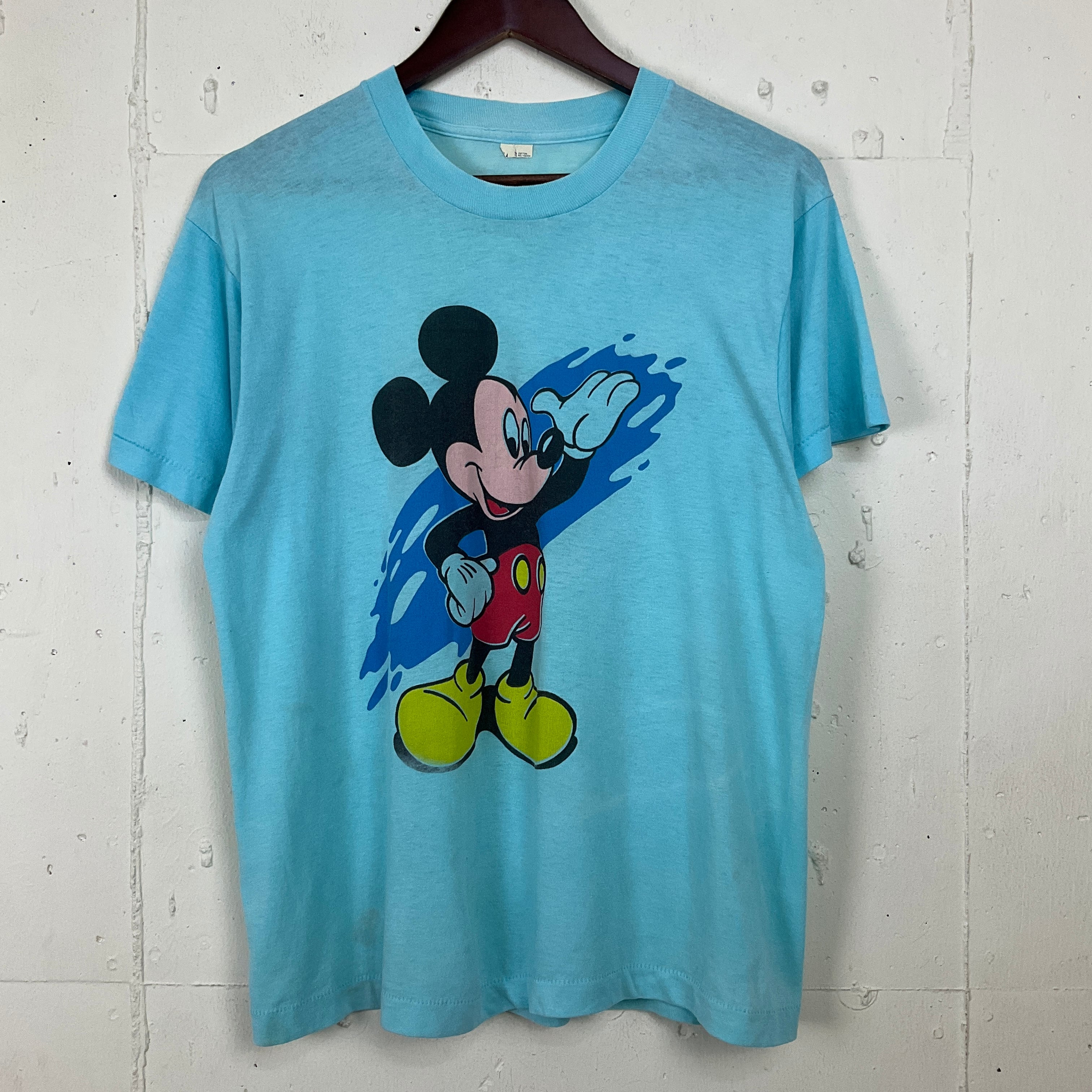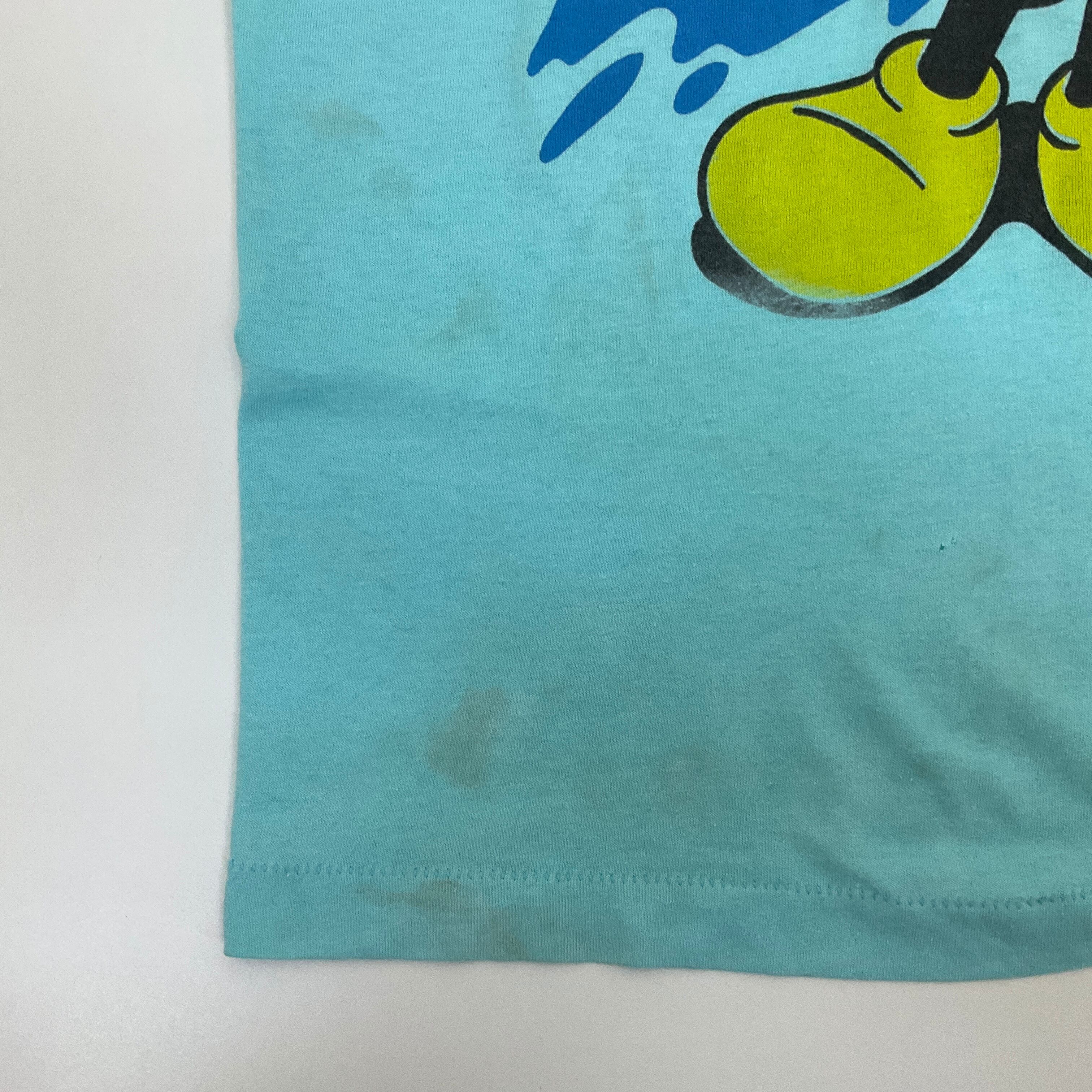 USA製 80年代 80s ミッキーマウス 染み込み キャラクター プリント Tシャツ 古着 ヴィンテージ ビンテージ メンズL レディース 水色 ライトブルー【f240528004】