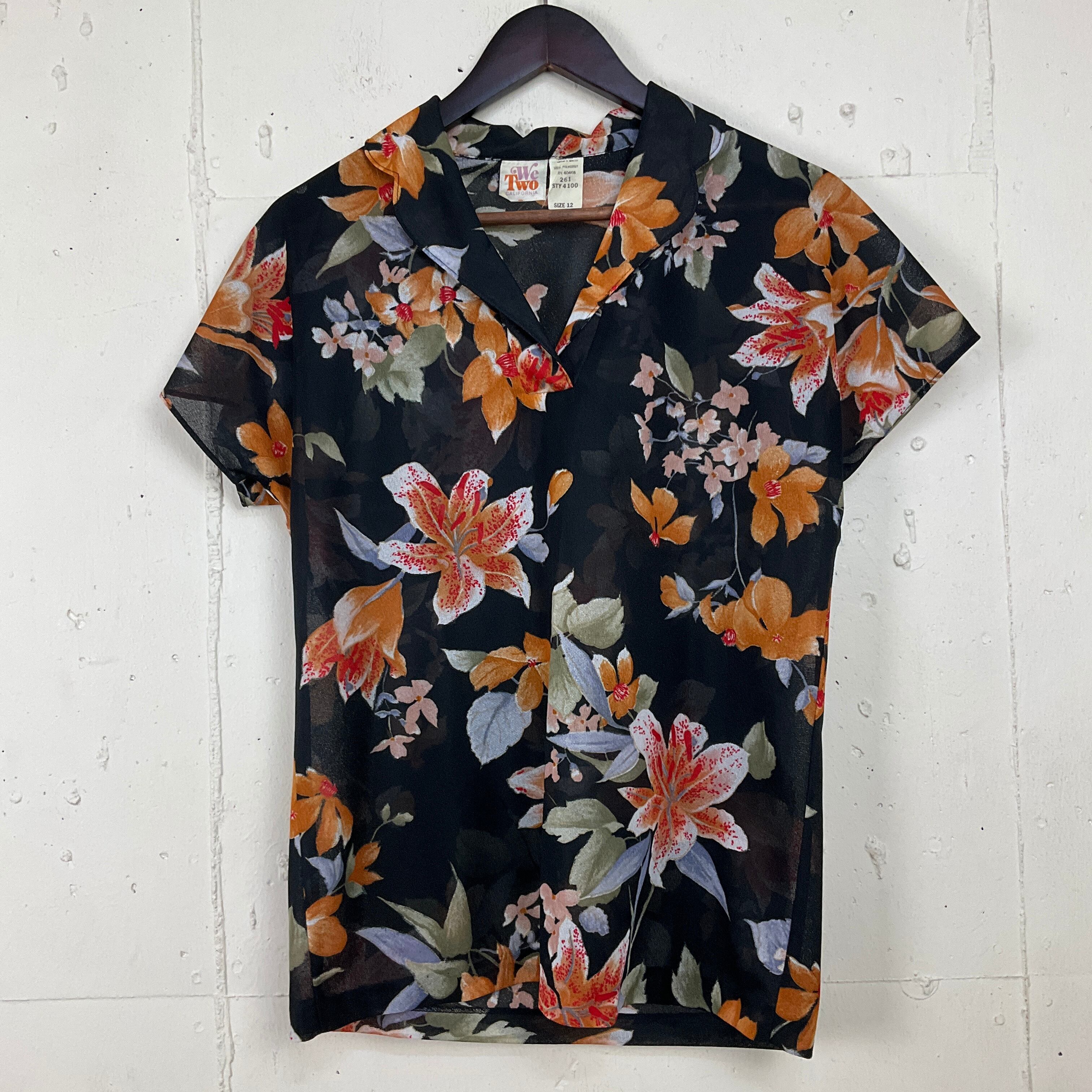 70年代 70s We Two CALFORNIA 花柄 総柄 シースルー 半袖シャツ ポリシャツ レディースL相当 古着 ヴィンテージ ビンテージ ブラック 黒 袖スリット【f240626009】