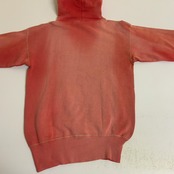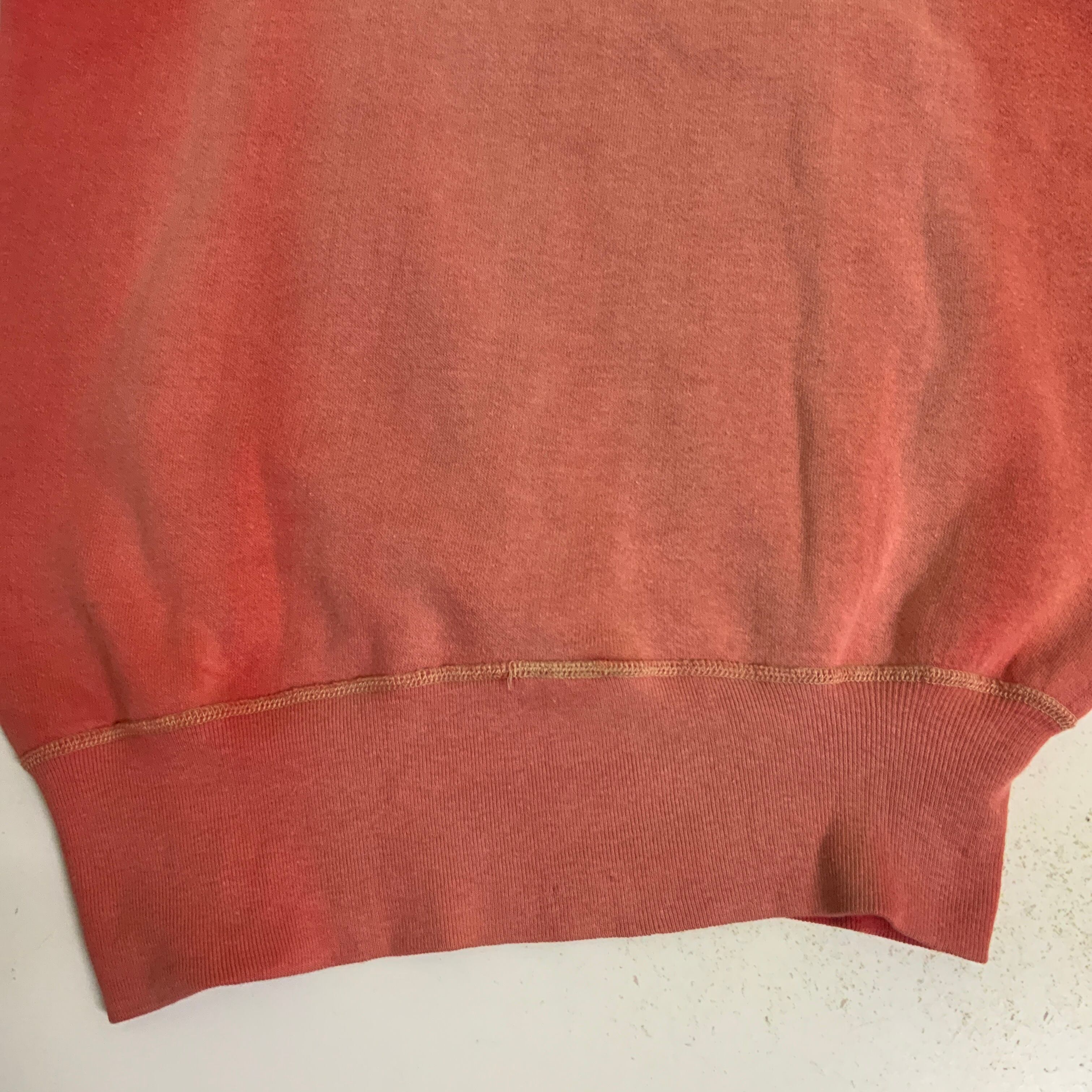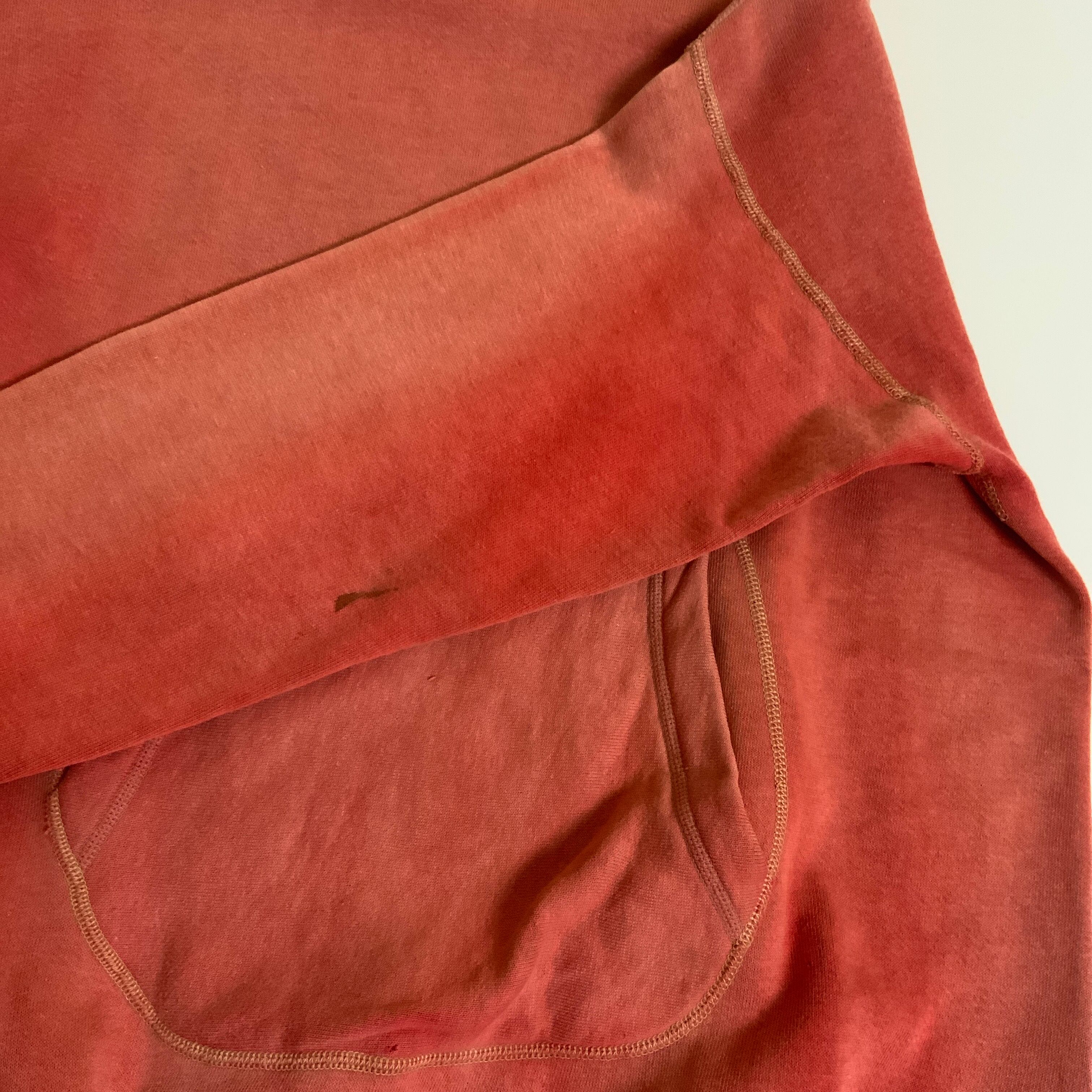 状態は左脇下に小穴があります。全体的に日焼けなどによる色ムラが激しくビンテージスウェットの赤色ならではの色ムラで良い雰囲気だと思います。所々に汚れなどもあります。 f241025001