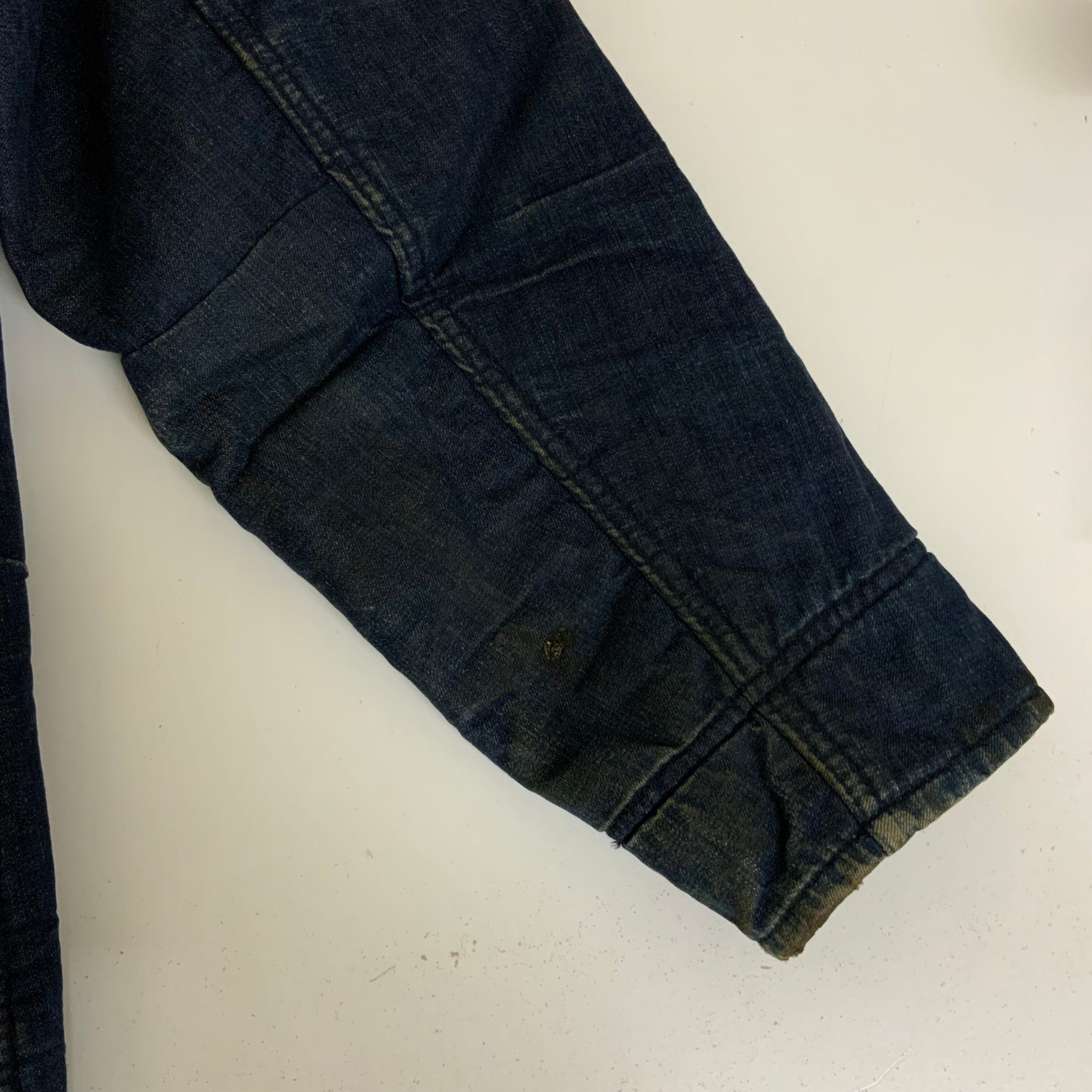 そでにペンキ汚れなどあり色濃い目の雰囲気系ヴィンテージカバーオールです。お直しがこし付近にあります。